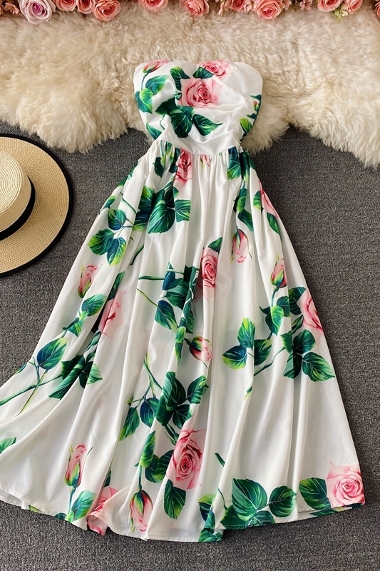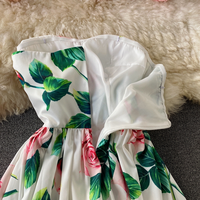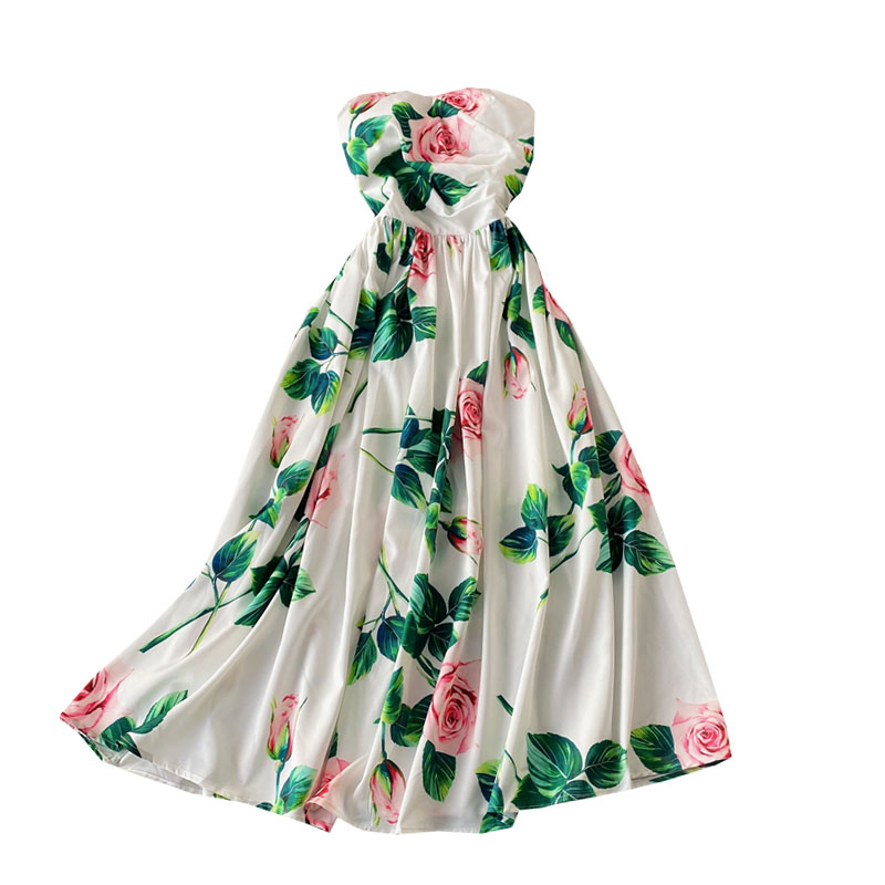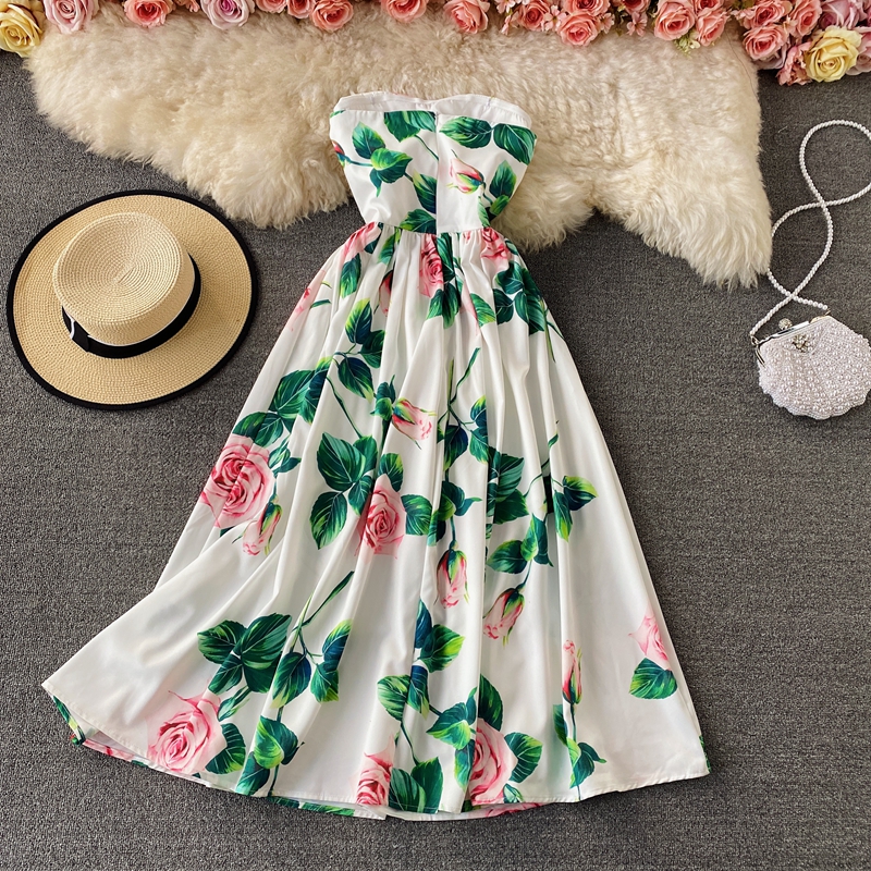 Holiday Sexy High Waist Rose Print off-the-Shoulder Tube Top Dress Vintage Pleated Elegant Dress Large Swing Dress