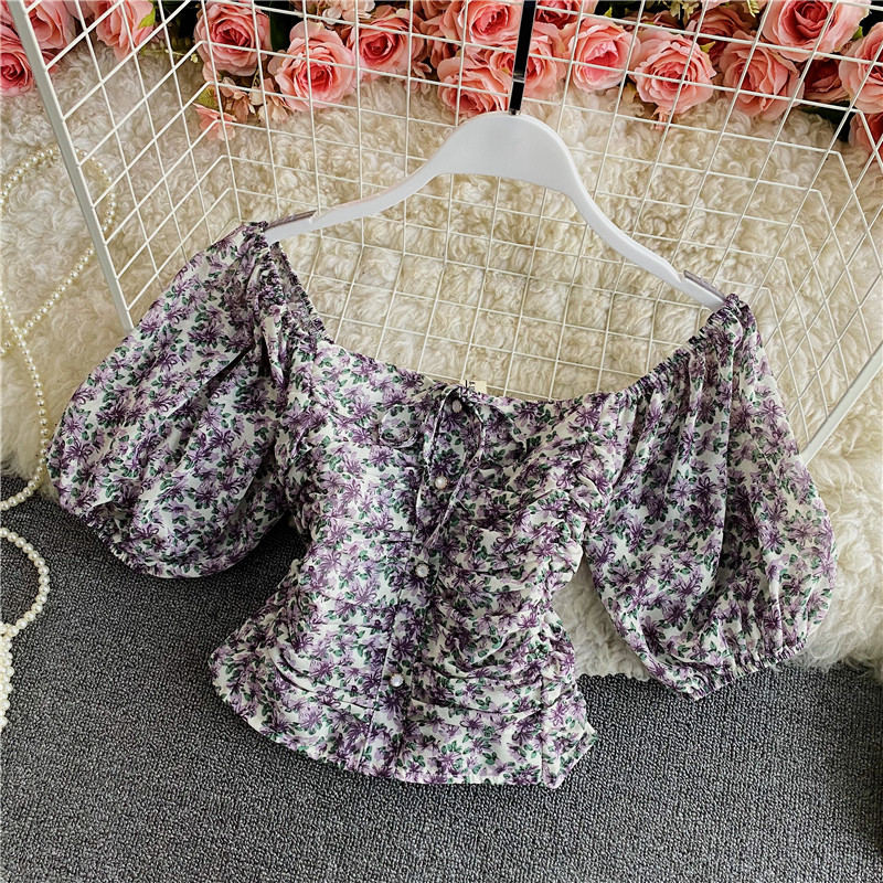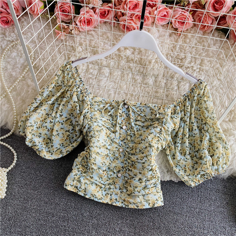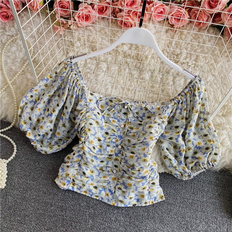 Cheap Blouse, Buy Quality Women’s Clothing Directly from China Suppliers:Women’s Floral Chiffon Shirt Summer Fashionable Square Collar Puff Sleeve Pleated Slim Fit Short Exposed Navel Heather Top