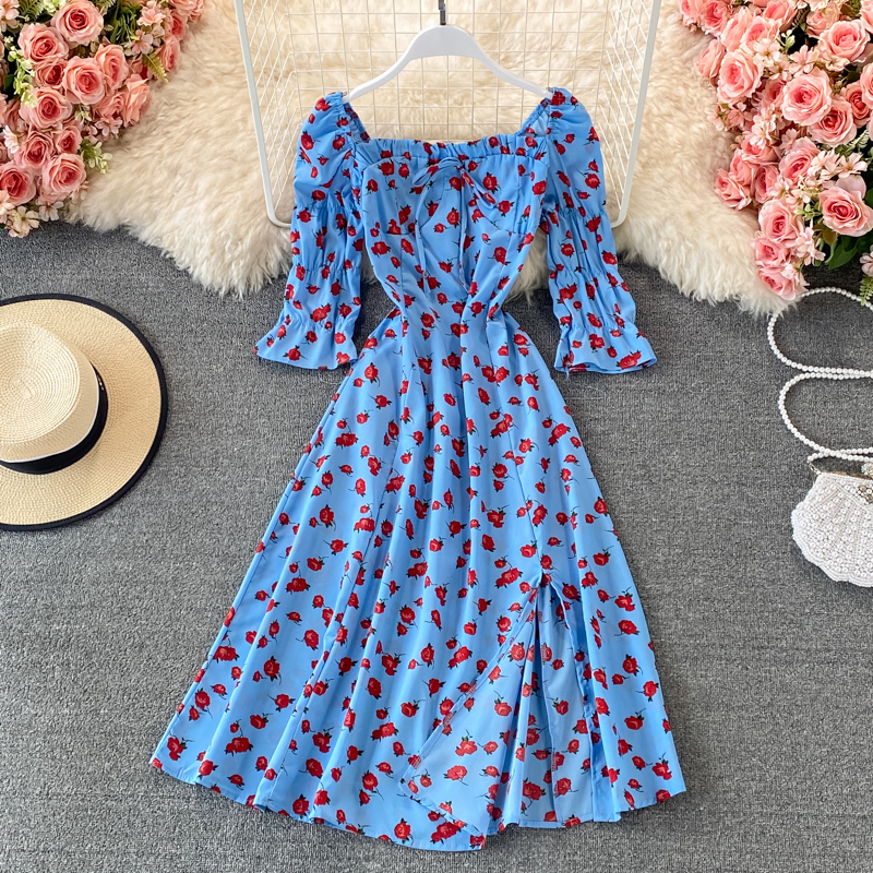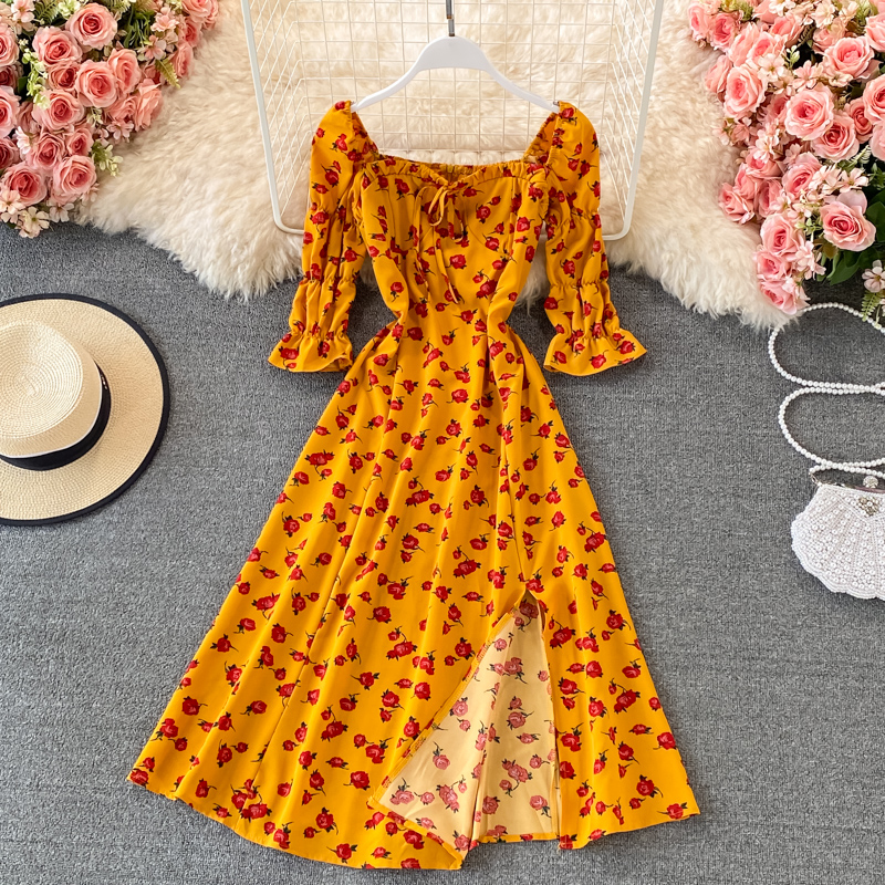 Cheap Dresses, Buy Quality Women’s Clothing Directly from China Suppliers:Square Collar Split Dress Summer Chiffon Floral Skirt Elegant Slim Fit Slimming Seaside Holiday Beach Dress A line Skirt