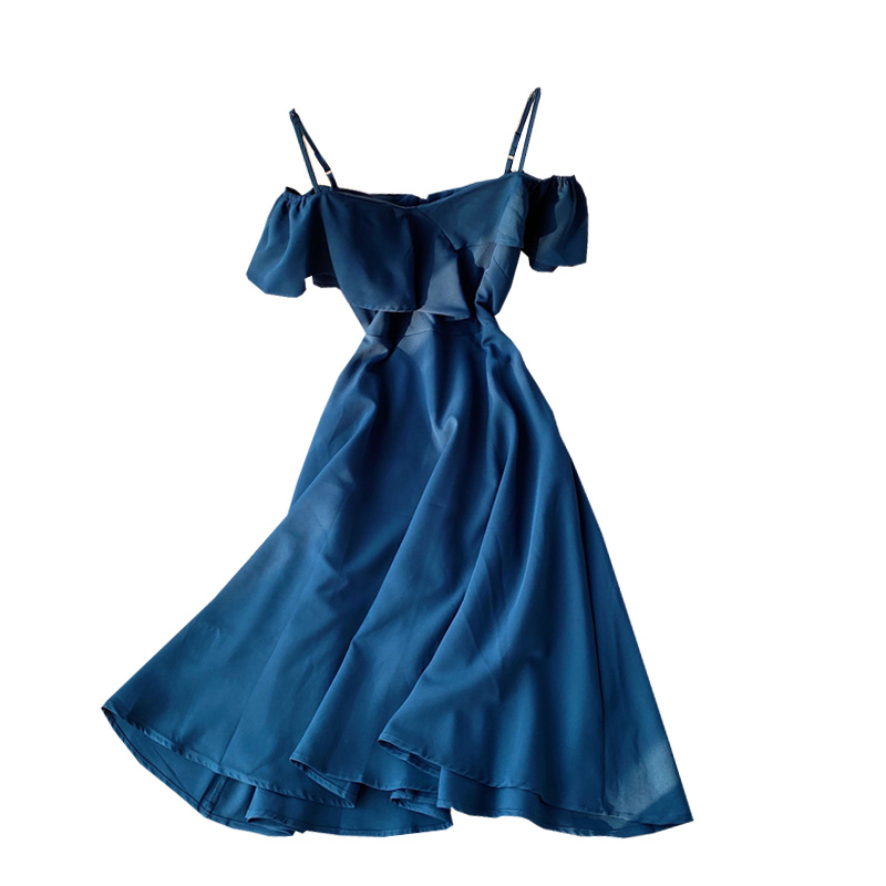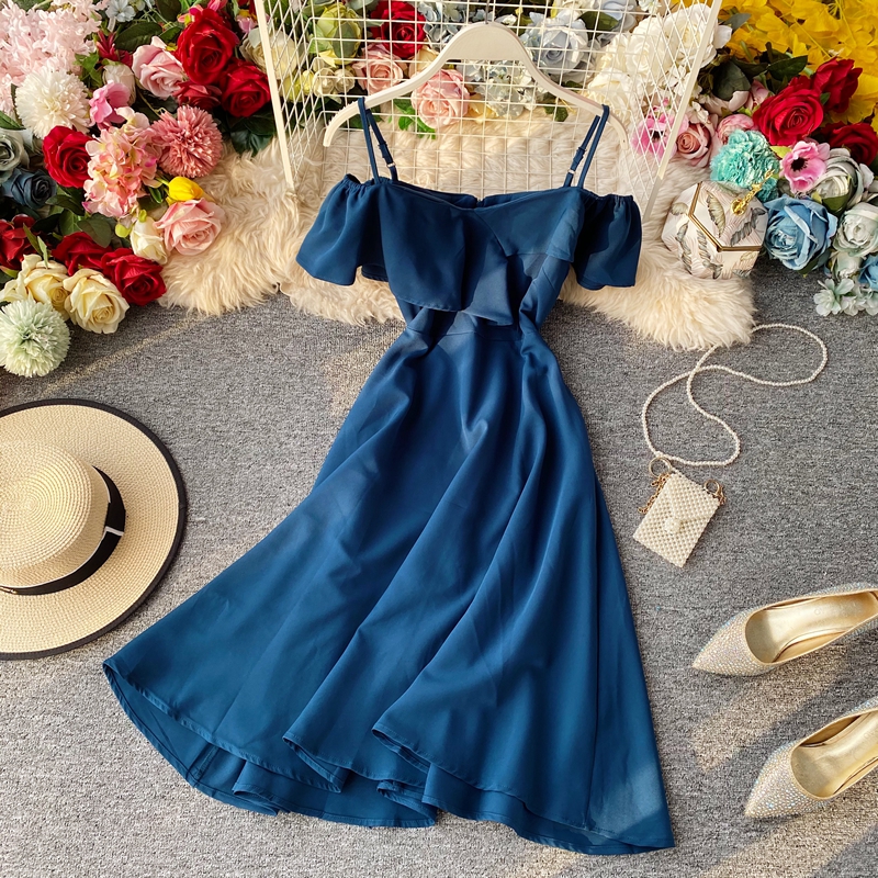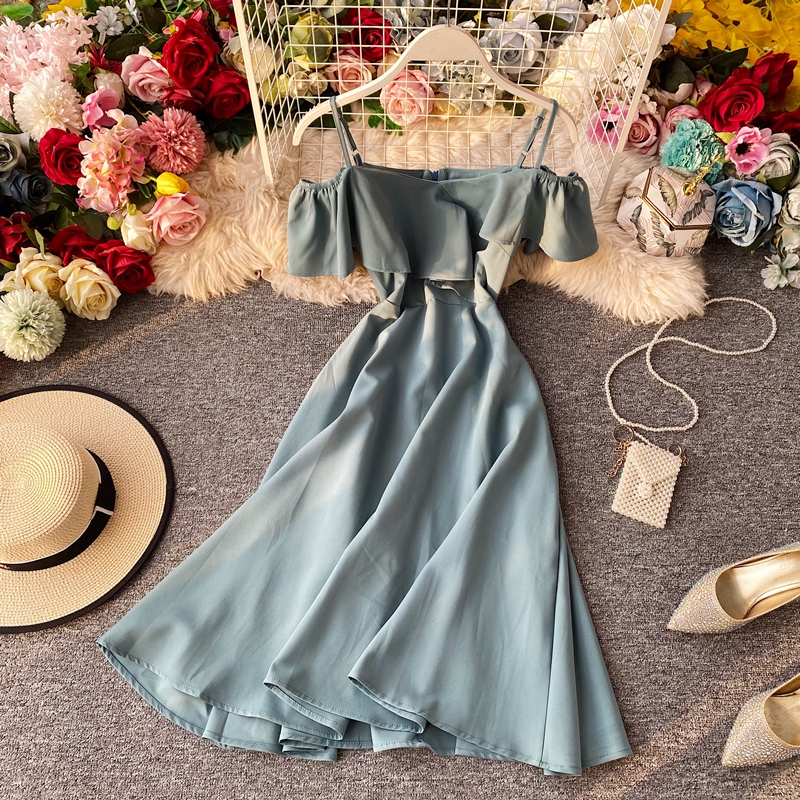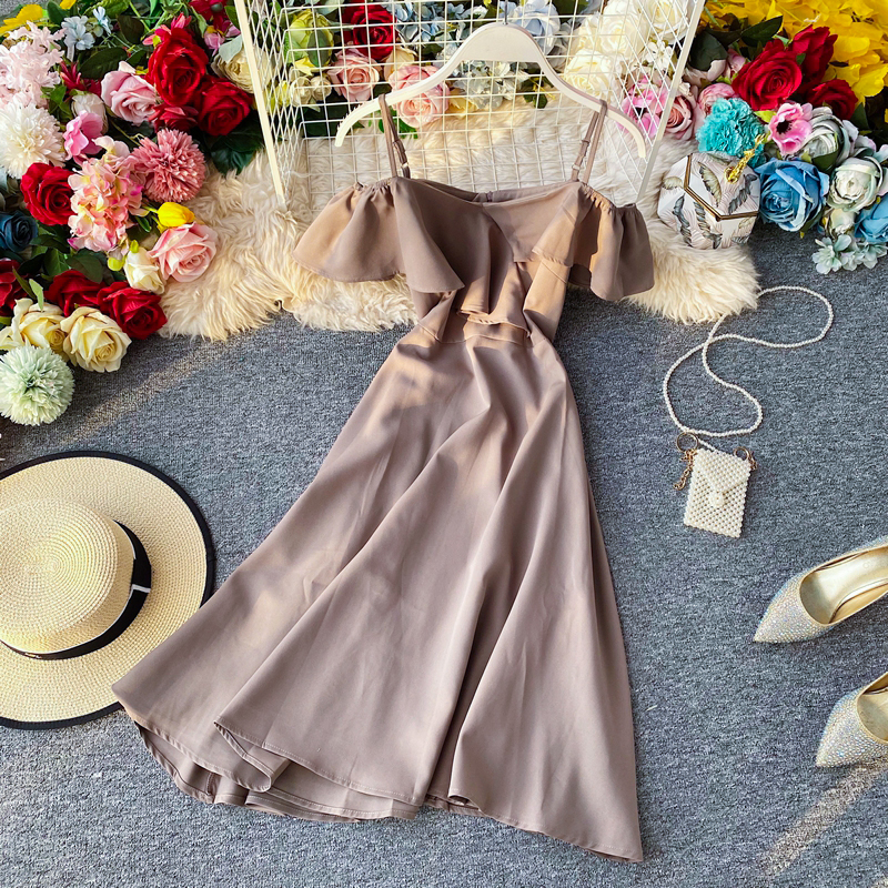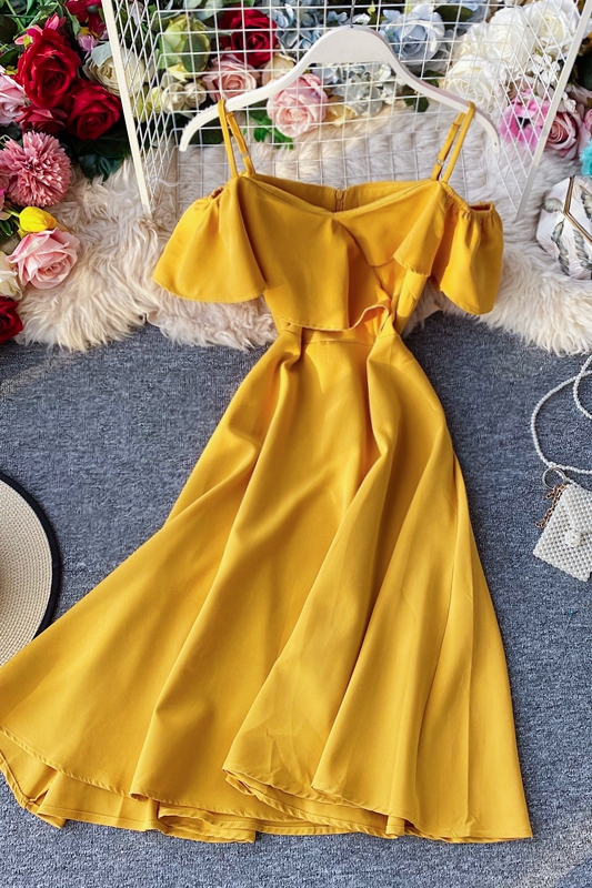 Off-Neck off-the-Shoulder Strap Dress Summer New Korean Style Small over-the-Knee Super Fairy Waist Trimming Yellow Dress