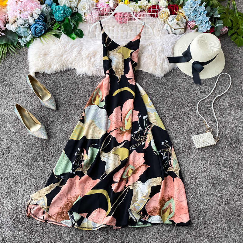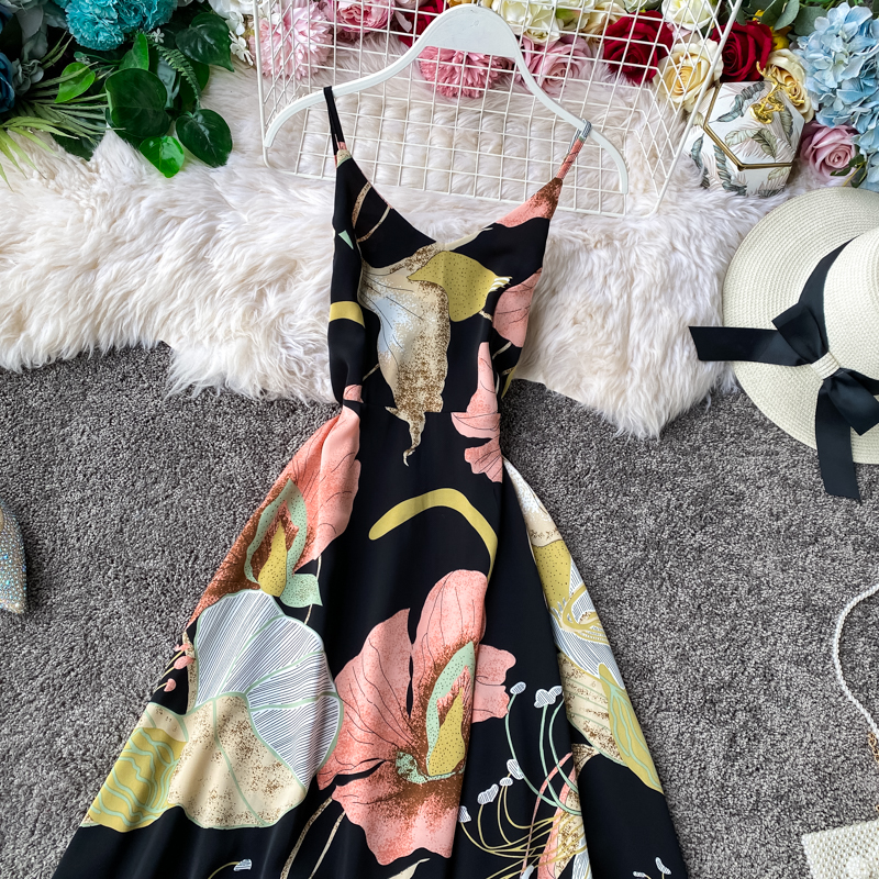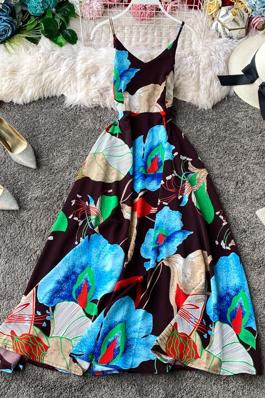 Seaside Vacation Style Chiffon Dress Women’s Floral V-neck Beach Dress Sleeveless Swing Seaside Vacation Long Dress