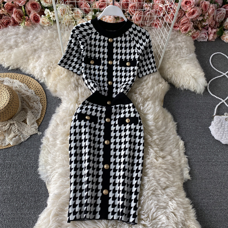 Cheap Dresses, Buy Quality Women’s Clothing Directly from China Suppliers:Summer new style Yujie temperament light cookedstyleSlimbag hip skirt houndstooth contrast color knitted dress with short sleeve