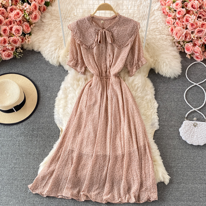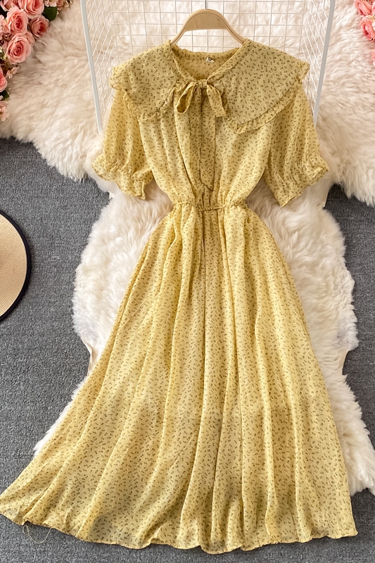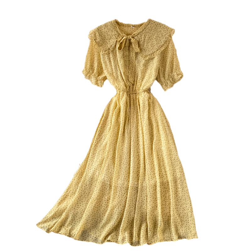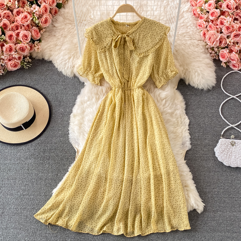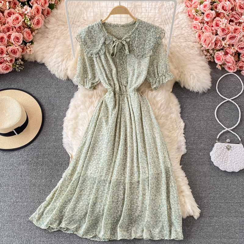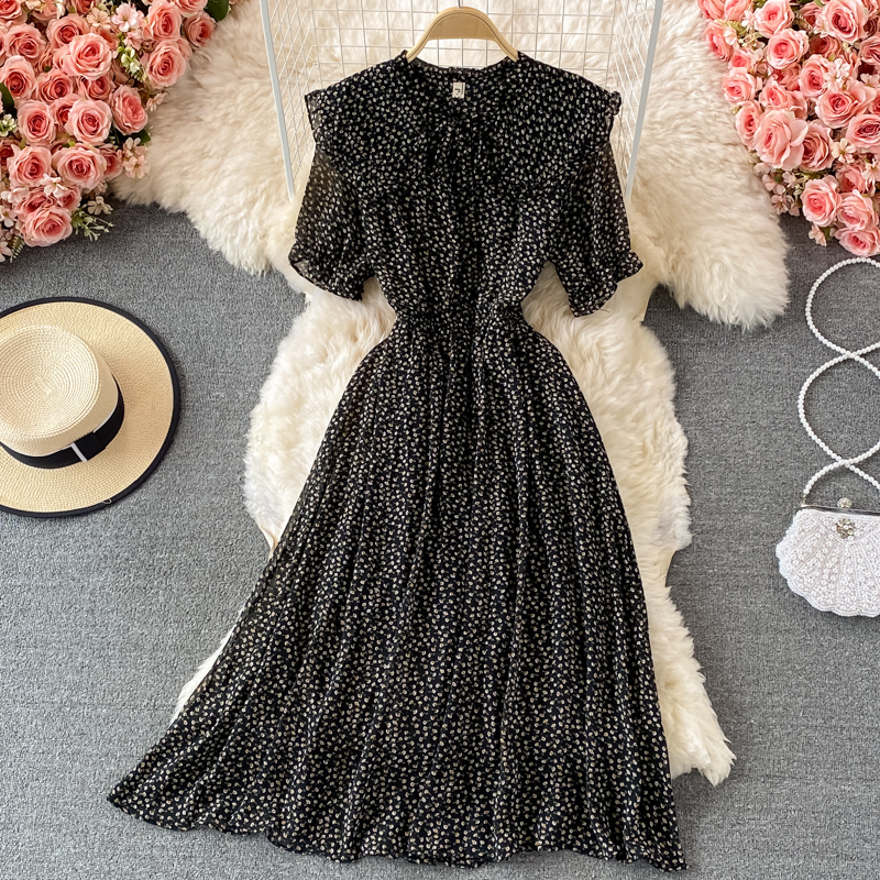 French Retro Sweet Floral Chiffon Dress Short Sleeve Summer New Waist Slimming Large Hem Long Dress
