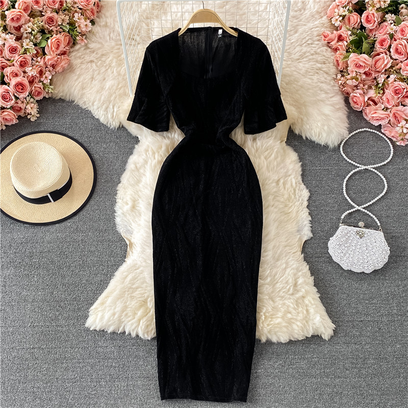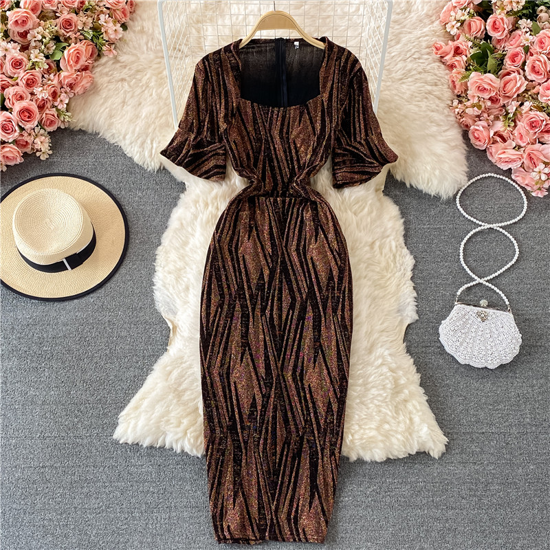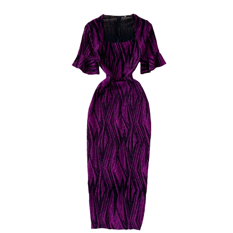 Fashion Ladies’ Evening Dress Summer New Temperament Square Collar Bright Silk Slim Fit Slimming Slit Sheath Dress