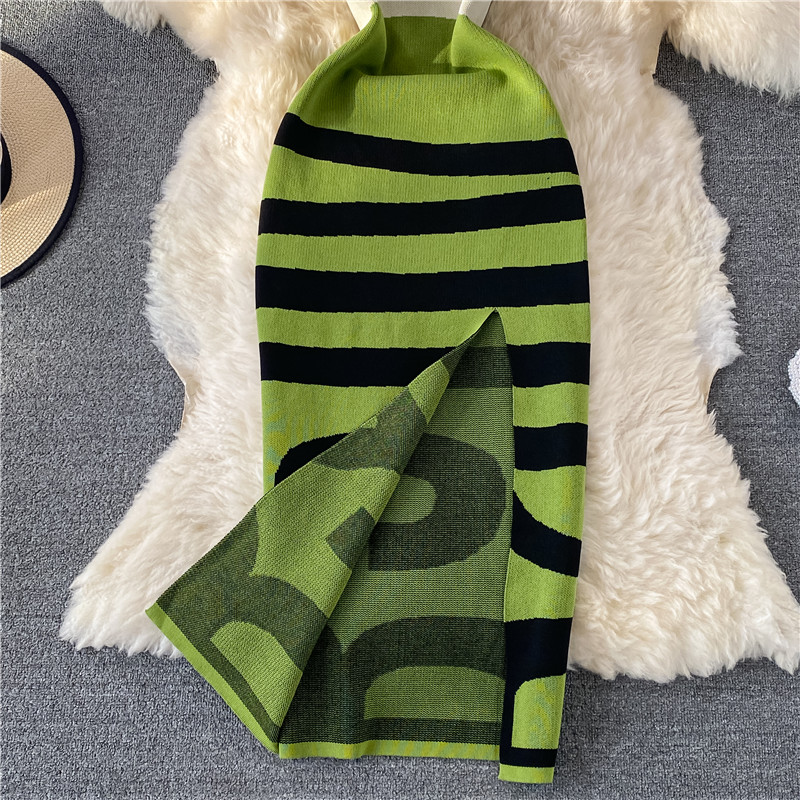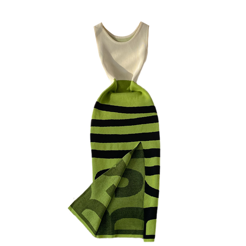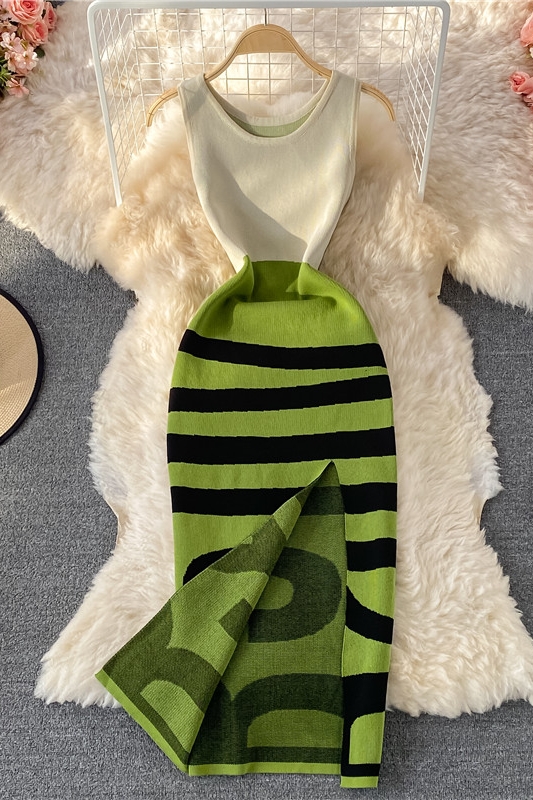 summer New Striped round Neck Waist Trimming Slimming Sweet Elegance Knitted Sheath Split Dress Sleeveless
