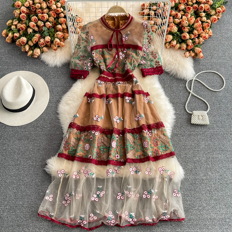 Cheap Dresses, Buy Quality Women’s Clothing Directly from China Suppliers:Summer New Retro High End Temperament Stand up Collar Tie Mesh Embroidery Stitching Lace A line Dress