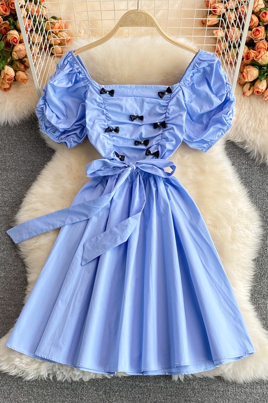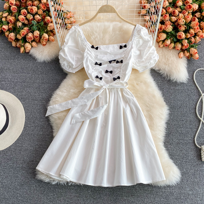 Cheap Dresses, Buy Quality Women’s Clothing Directly from China Suppliers:Korean Dongdaemun Summer Rhinestone Bow Square Collar Puff Sleeve Pleated Dress Mid Length A line Dress