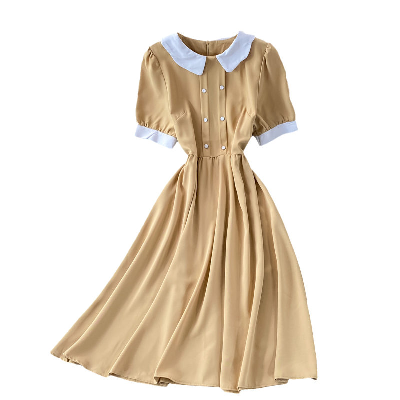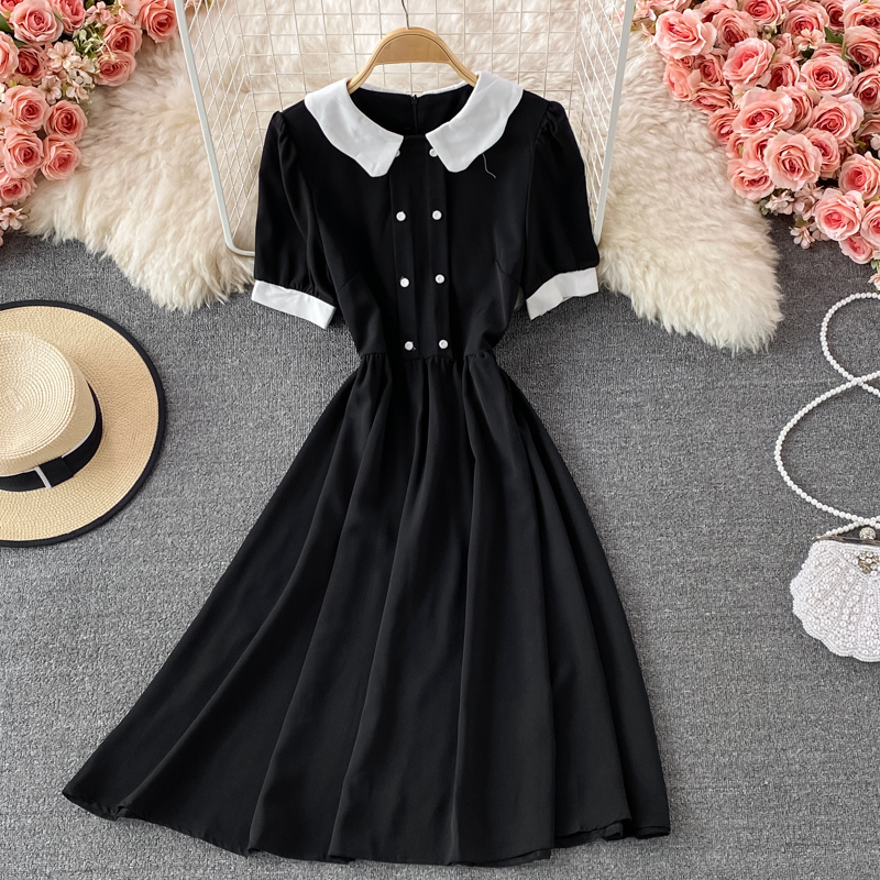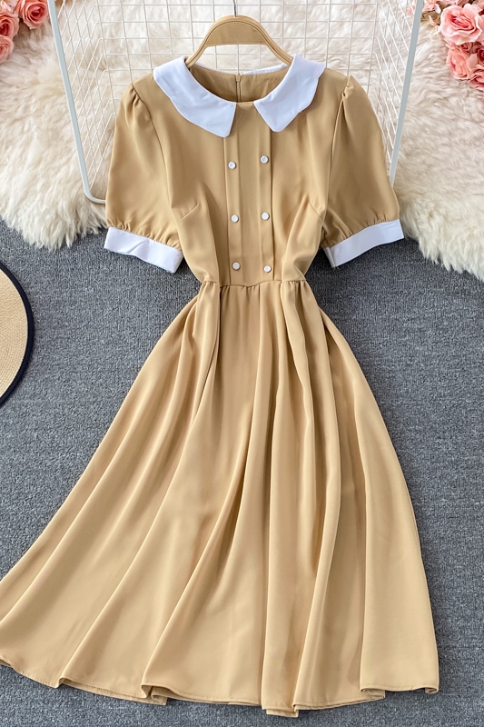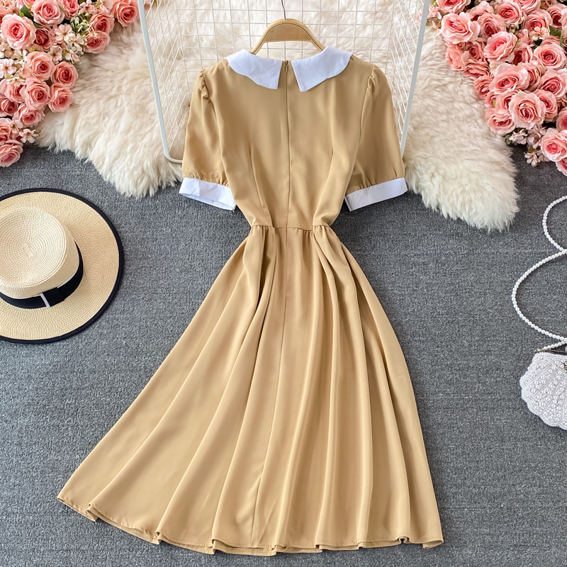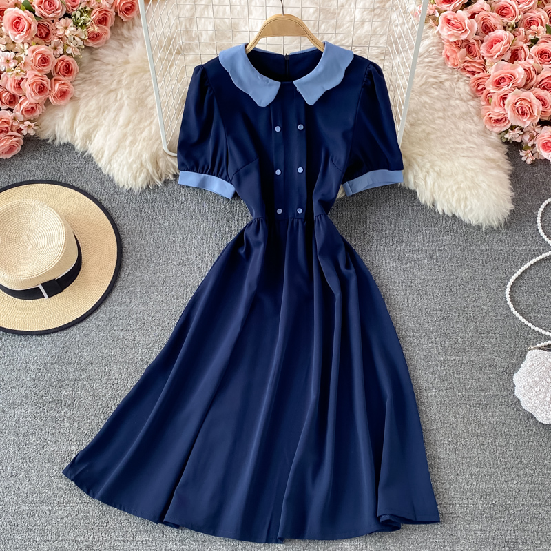 Cheap Dresses, Buy Quality Women’s Clothing Directly from China Suppliers:Korean Chic Summer Retro French Art Younger Contrast Color Doll Collar Loose Slimming Puff Sleeve Dress for Women