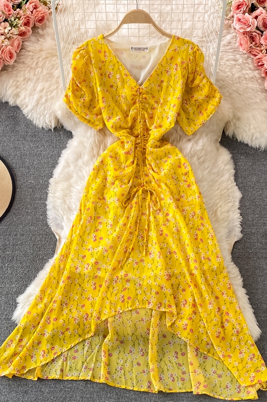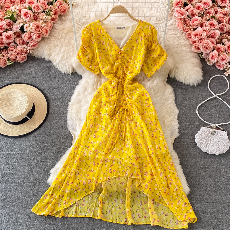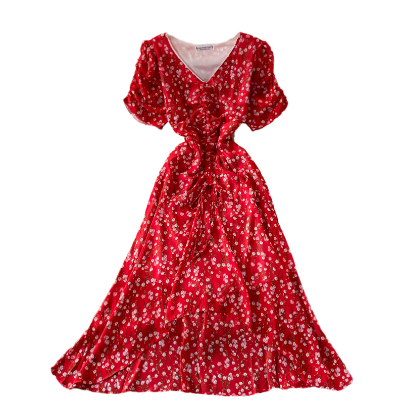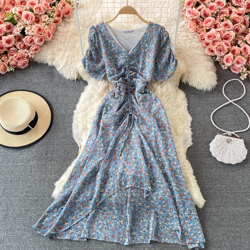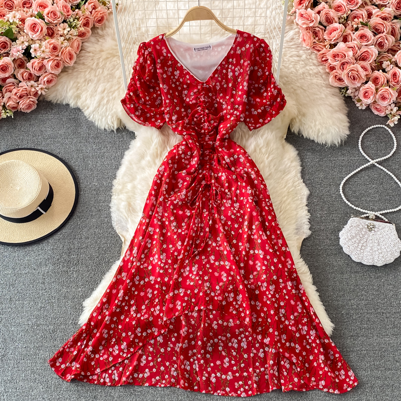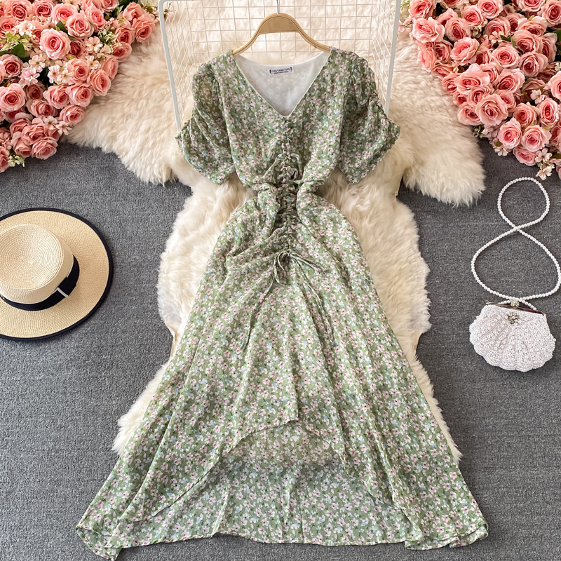 Cheap Dresses, Buy Quality Women’s Clothing Directly from China Suppliers:Women’s V neck Pleated Slim Fit Waist Tight Chiffon Dress, Fashionable, Small, Clear and Loose, Floral Skirt