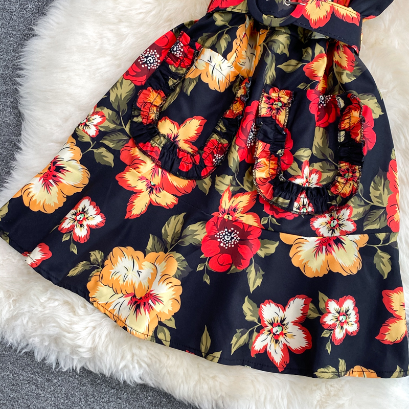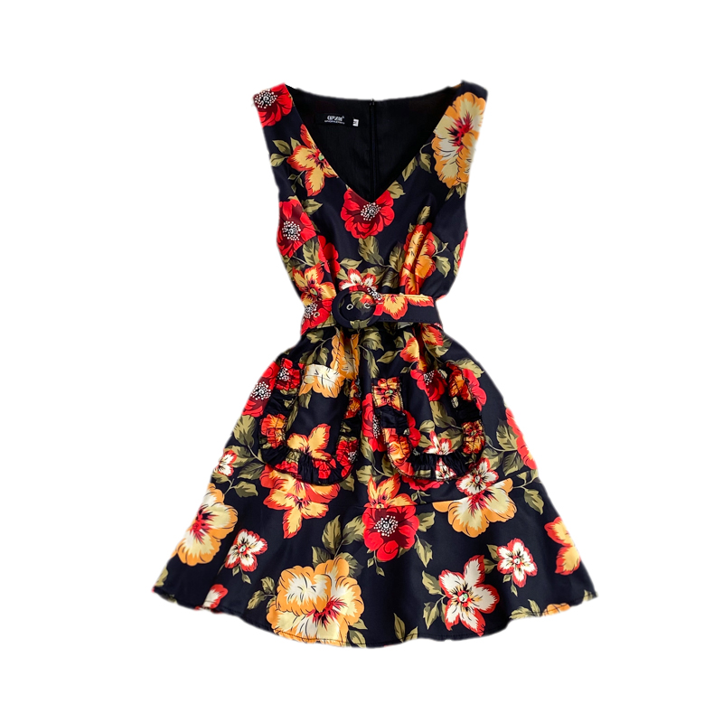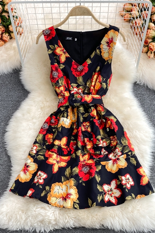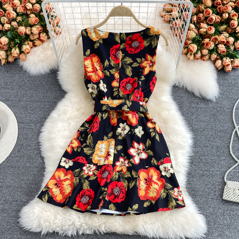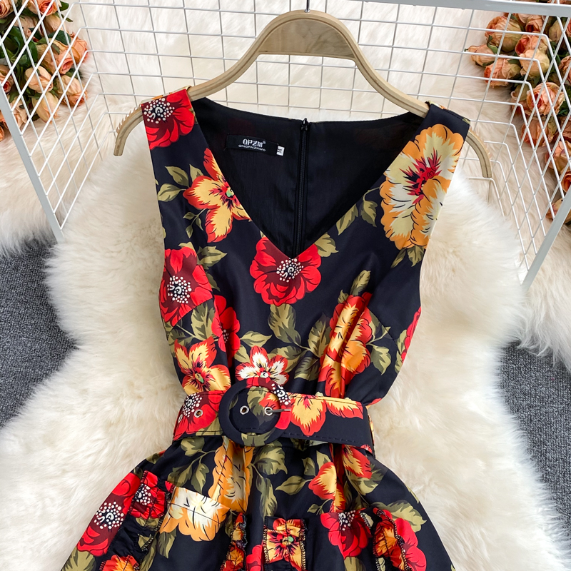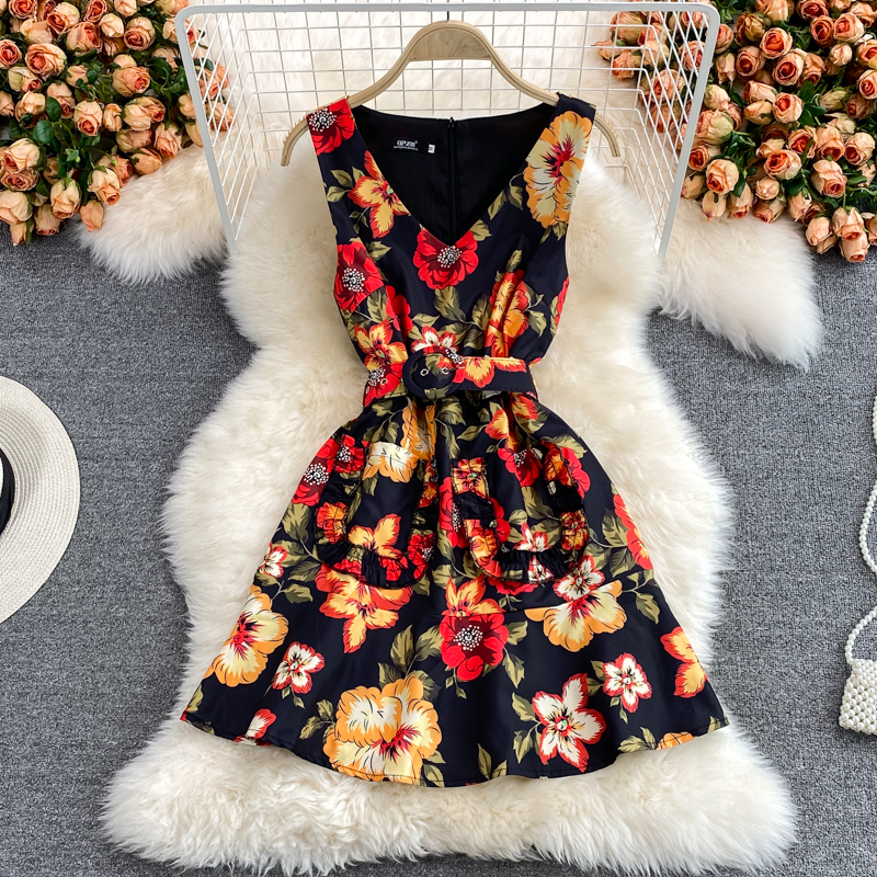 Cheap Dresses, Buy Quality Women’s Clothing Directly from China Suppliers:summer New Retro Printed Waist Controlled Slimming V Neckline Sleeveless Dress Small A line Skirt Short Skirt