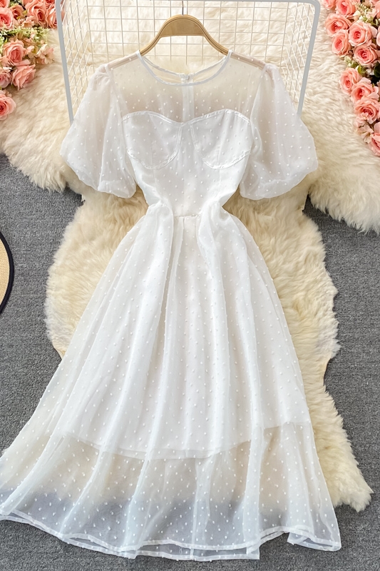 summer new style Korean version of French retro court style temperament waist round neck puff sleeve big swing chiffon dress
