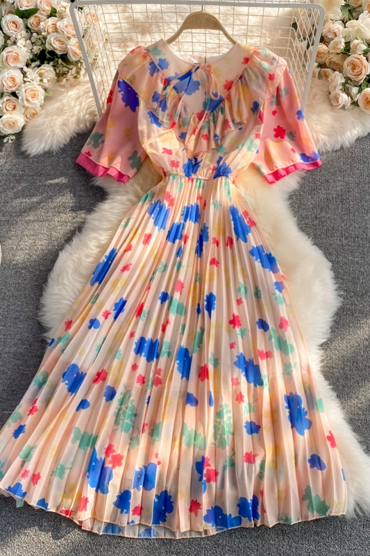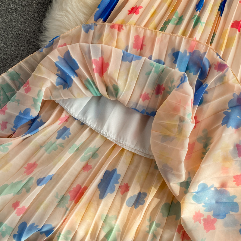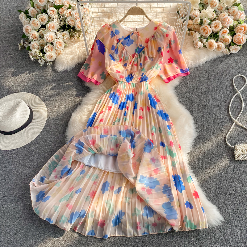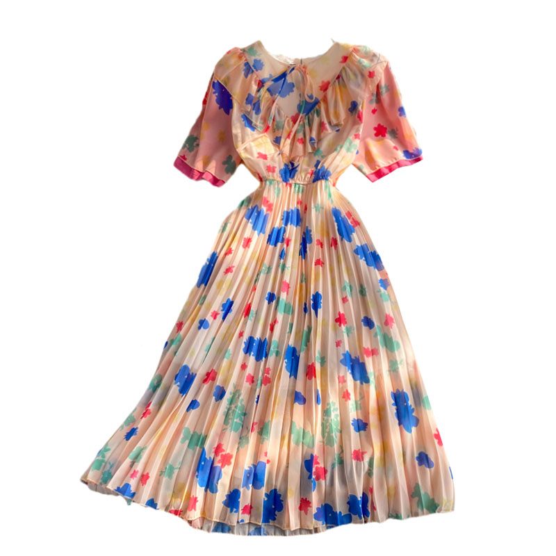 Summer New French Style Retro Kikyo First Love Super Mori Tight Waist Slim round Neck Chiffon Pleated Dress