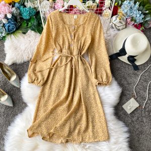 Cheap Dresses, Buy Quality Women’s Clothing Directly from China Suppliers:Korean Chic Summer Retro French round Neck Waist Trimming Slimming Lace up Large Swing Dress Puff Sleeve Floral Dress