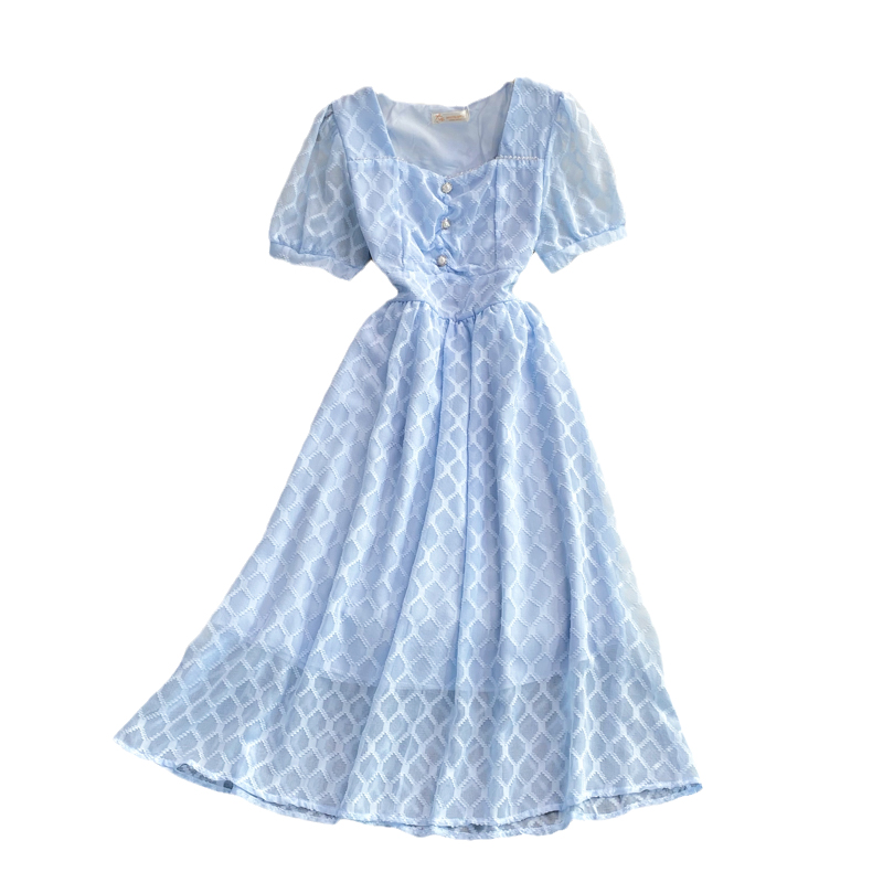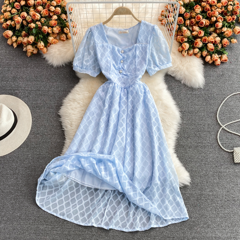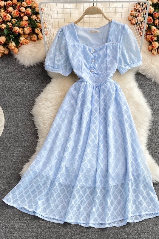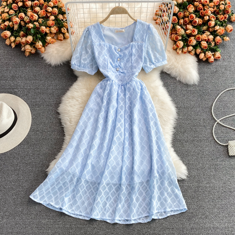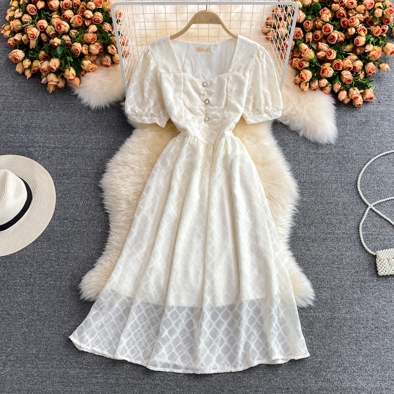 Cheap Dresses, Buy Quality Women’s Clothing Directly from China Suppliers:French square neck dress women summer new style European goods temperament waist puff sleeve mid length skirt short sleeves