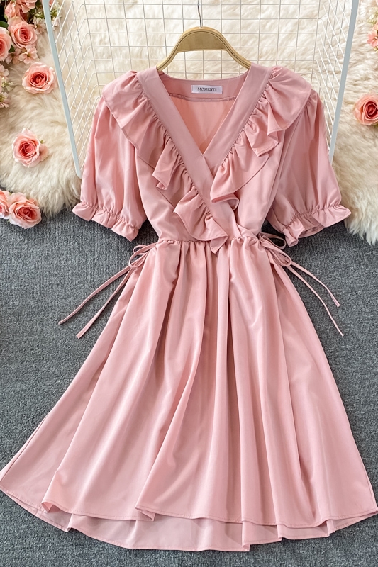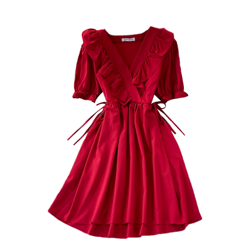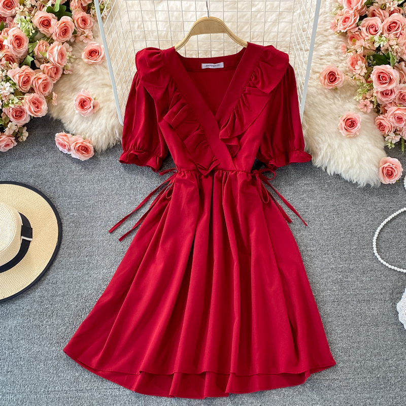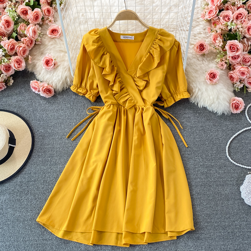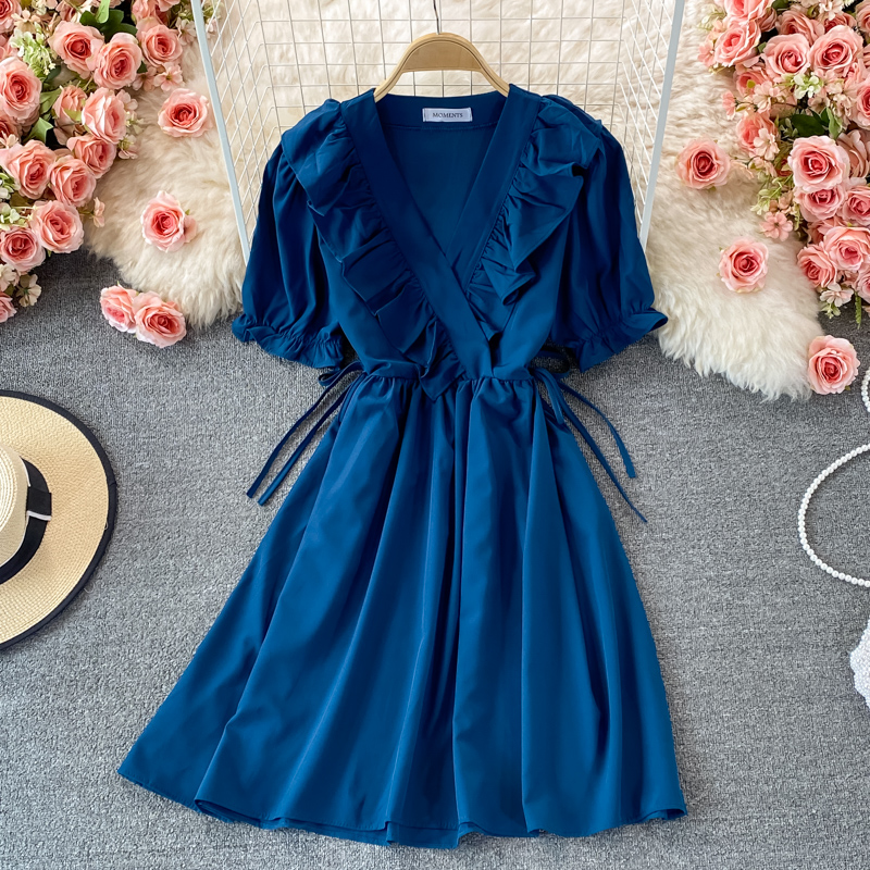 Cheap Dresses, Buy Quality Women’s Clothing Directly from China Suppliers:summer New Lace up Waist Controlled Slimming Mid Length Elegant Ruffle Puff Sleeve V neck A line Dress