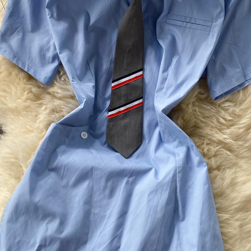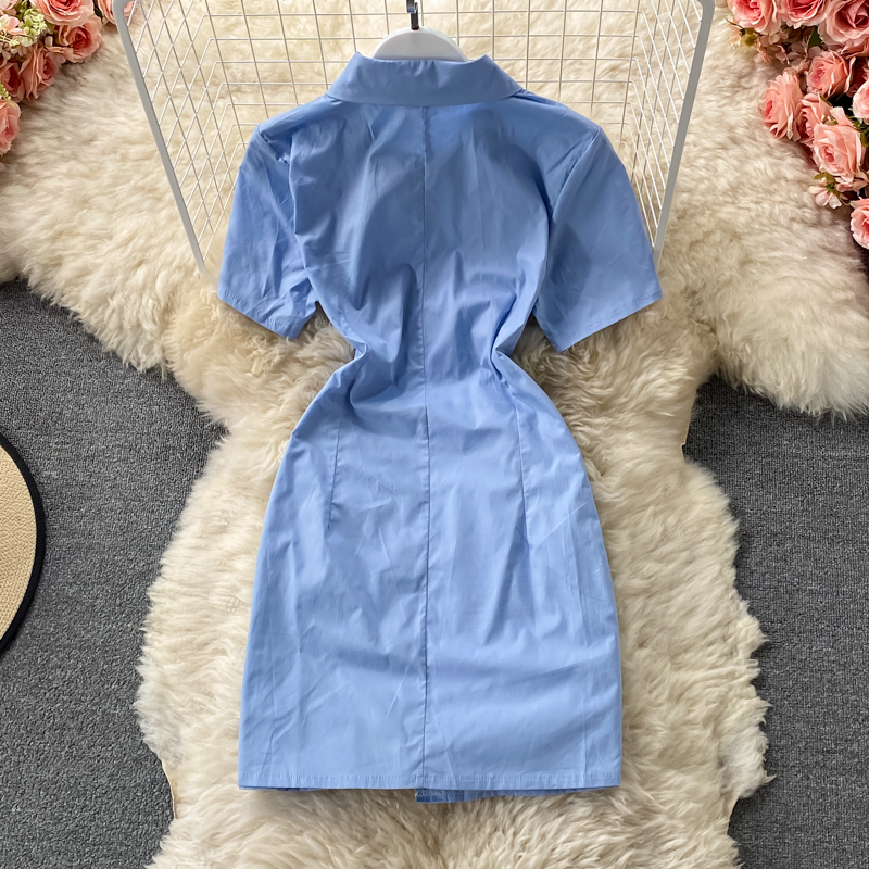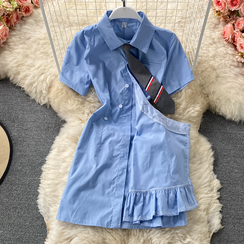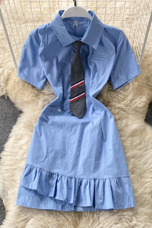 Korean fan girl blue short-sleeved female summer Korean style design self-cultivation college style tie pleated dress