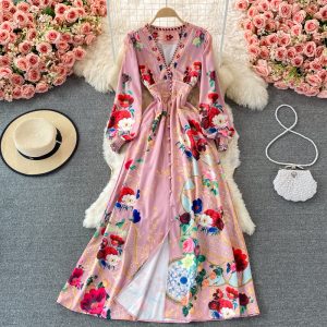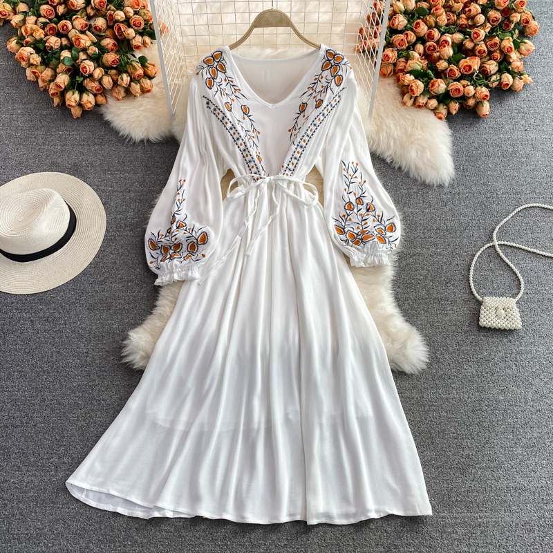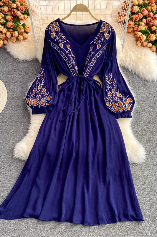 Cheap Dresses, Buy Quality Women’s Clothing Directly from China Suppliers:Ethnic Embroidery Temperament V neck Lace up Waist Controlled Slimming Trip Shoot Holiday Dress Puff Sleeve Swing Long Dress