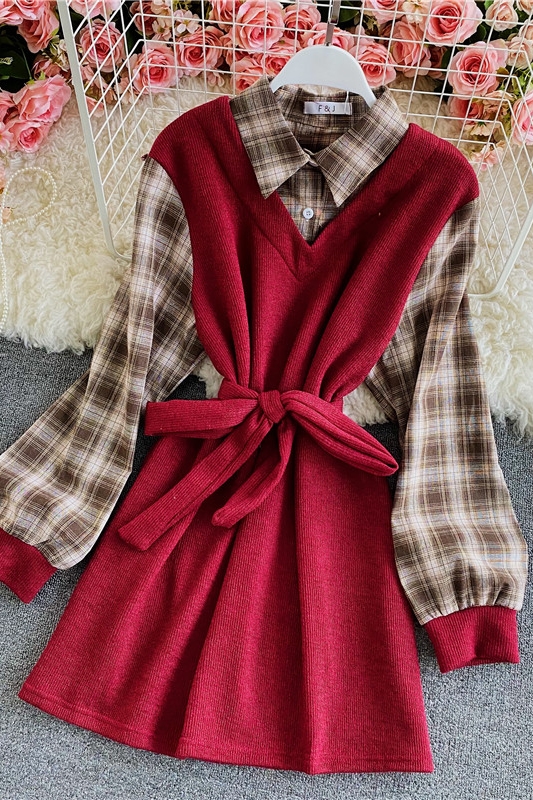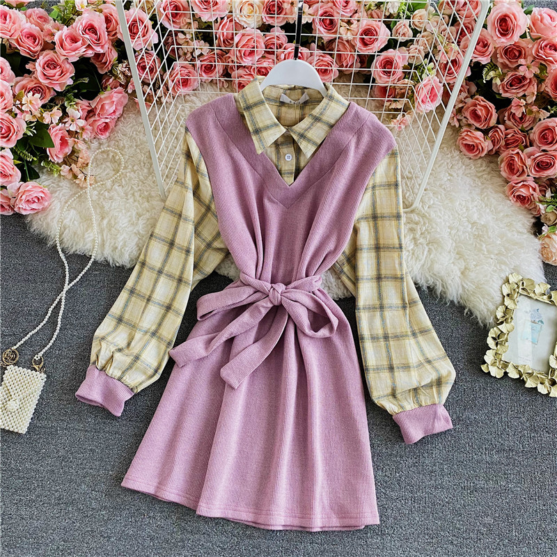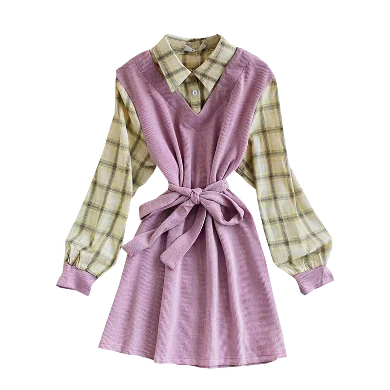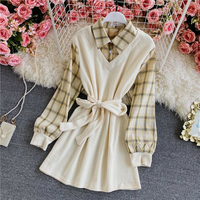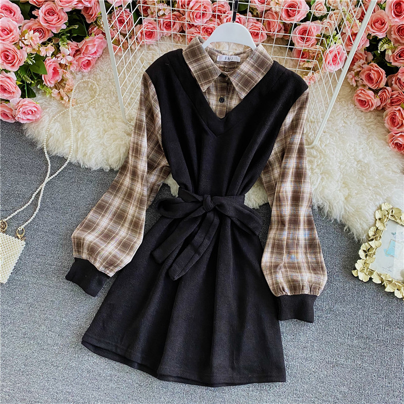 Cheap Dresses, Buy Quality Women’s Clothing Directly from China Suppliers:Shirt skirt female spring and autumn new fake two piece splicing long sleeved plaid temperament Korean style waist short skirt