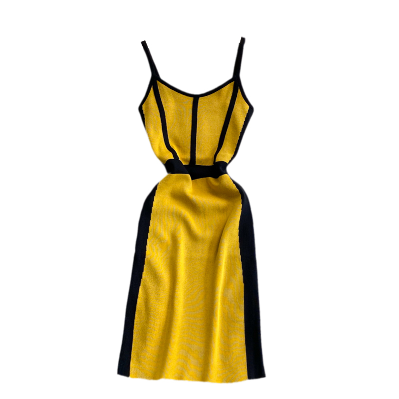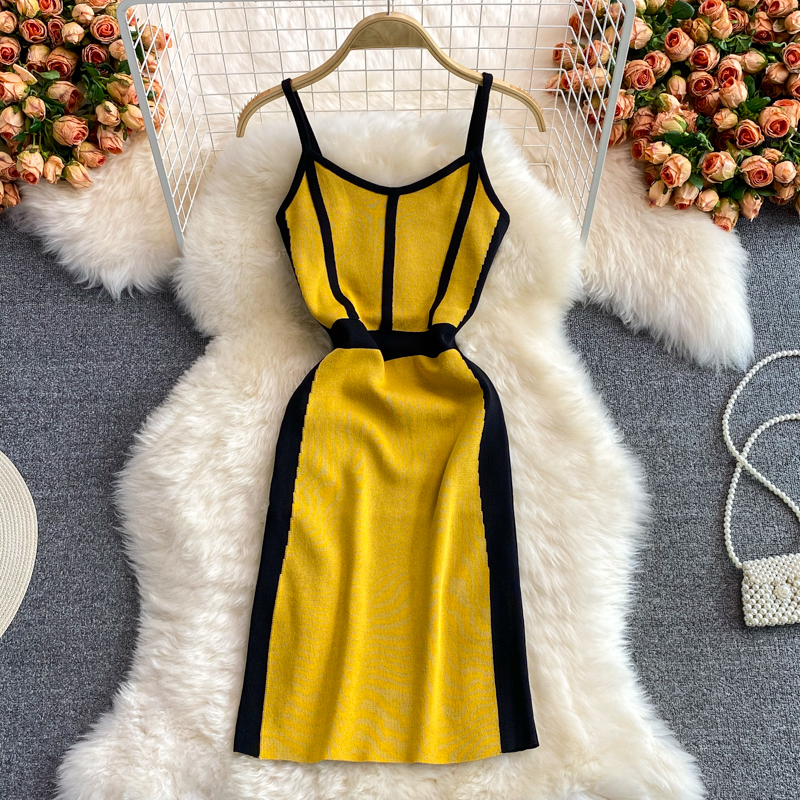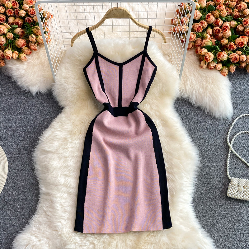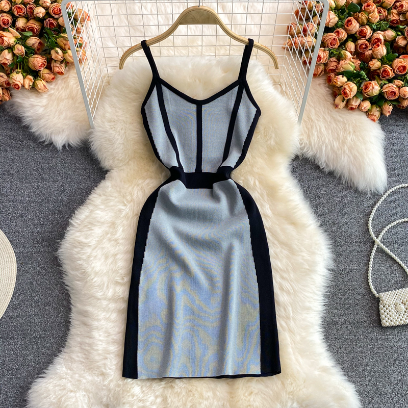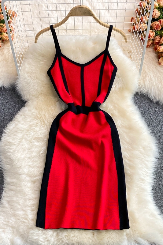 Korean Style Summer New Contrast Color Knitted V-neck Strap Vest Skirt Small Elastic Hip Bottoming Dress