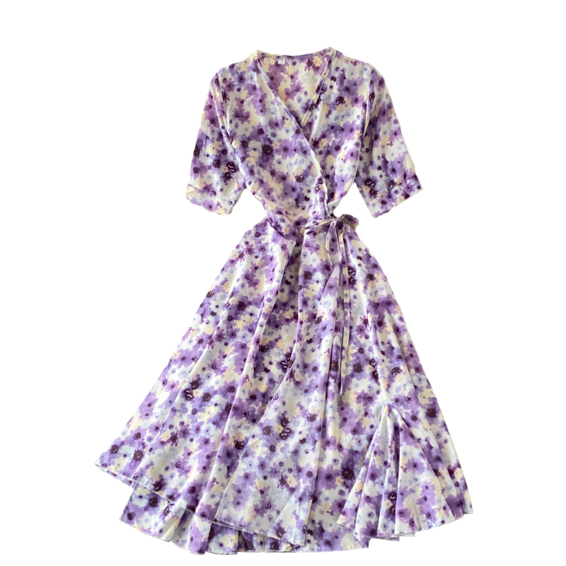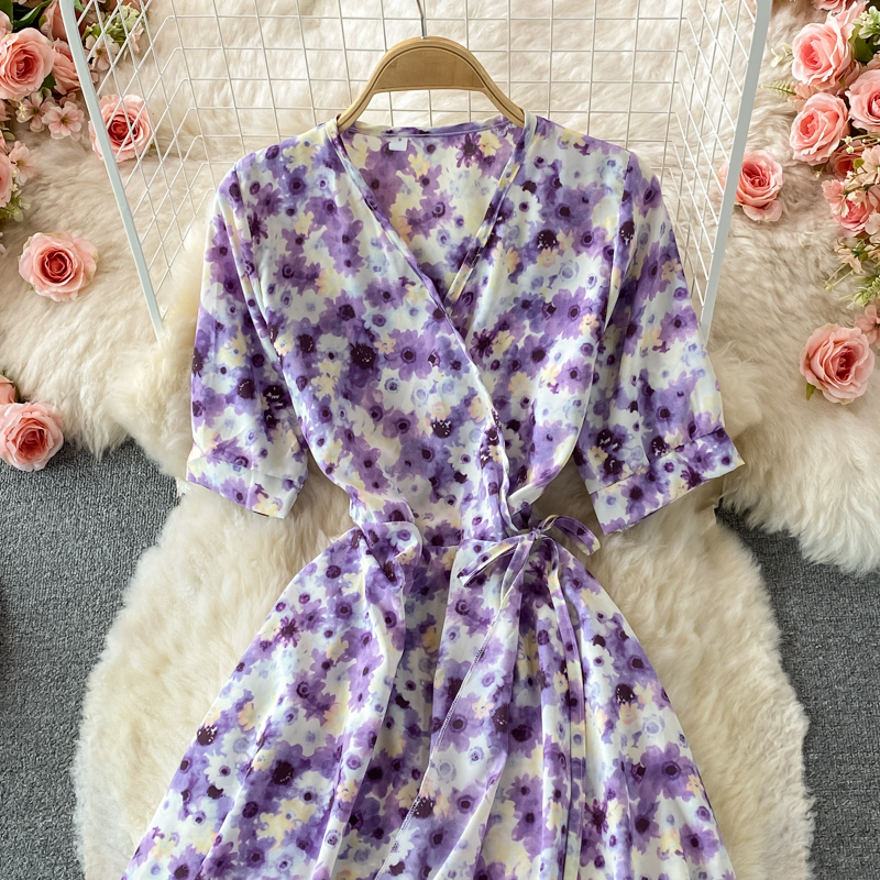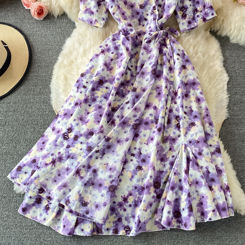 Cheap Dresses, Buy Quality Women’s Clothing Directly from China Suppliers:French Tea Break Puff Sleeve First Love Retro Purple Floral Skirt Mid Length Ruffled Chiffon V neck Dress Summer