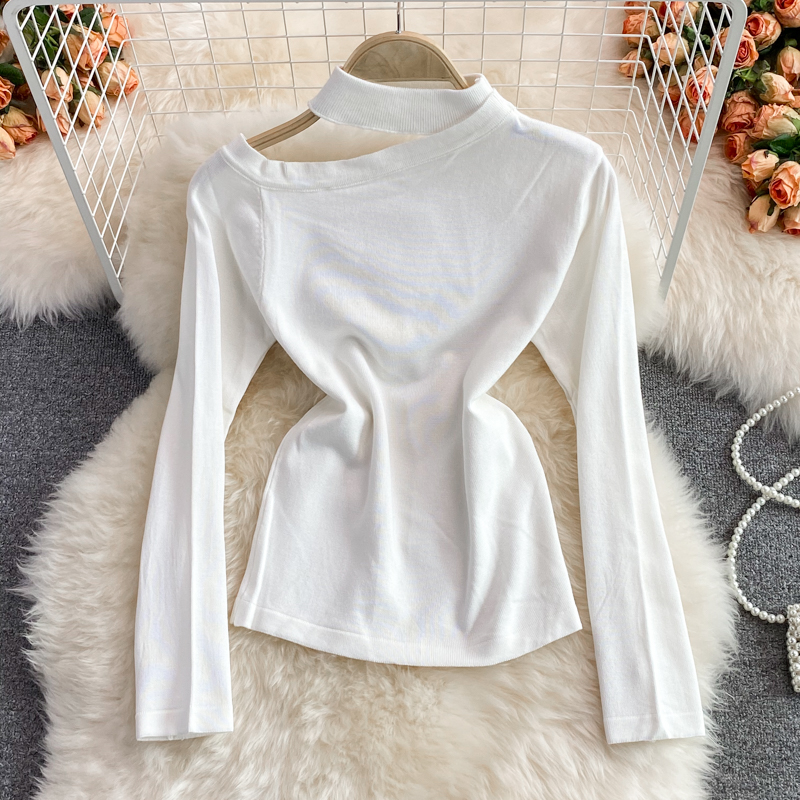 autumn and winter Korean style hanging neck unilateral off-shoulder short long-sleeved tight stretch bottoming sweater