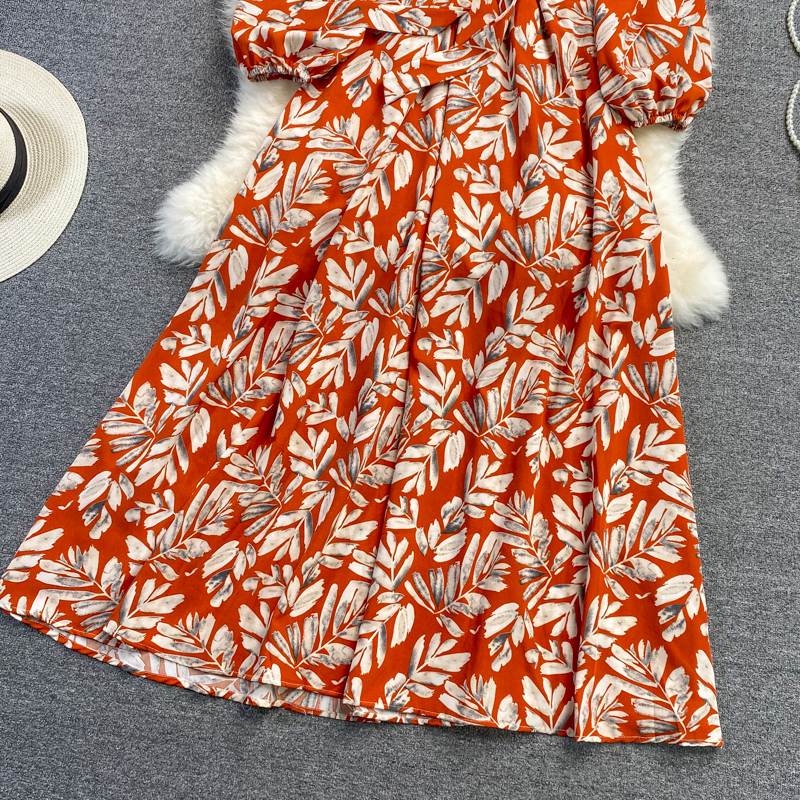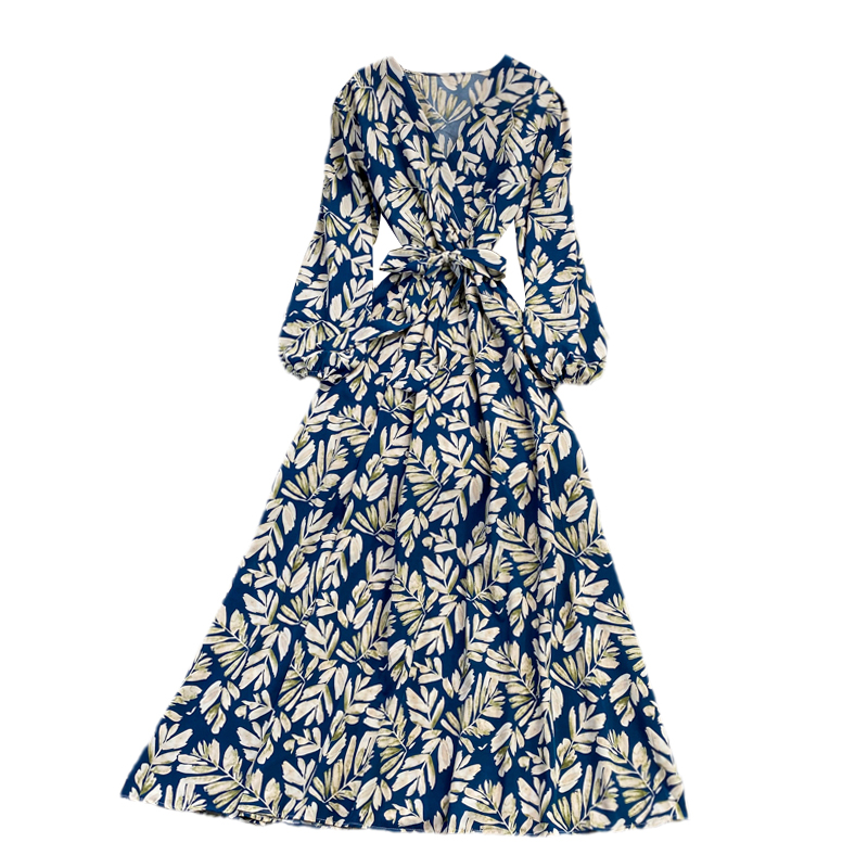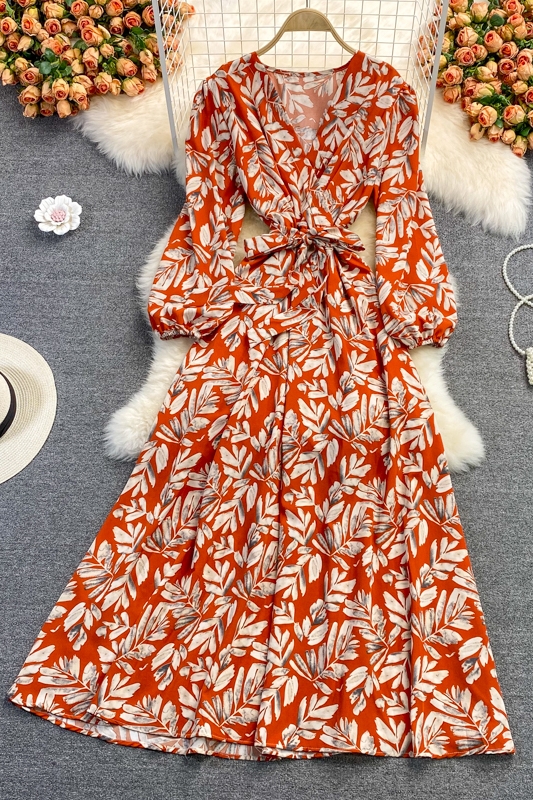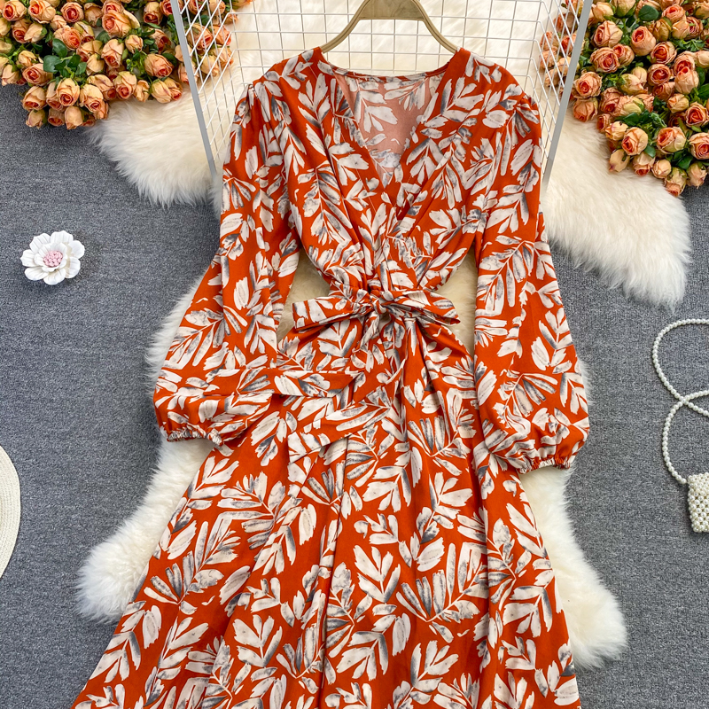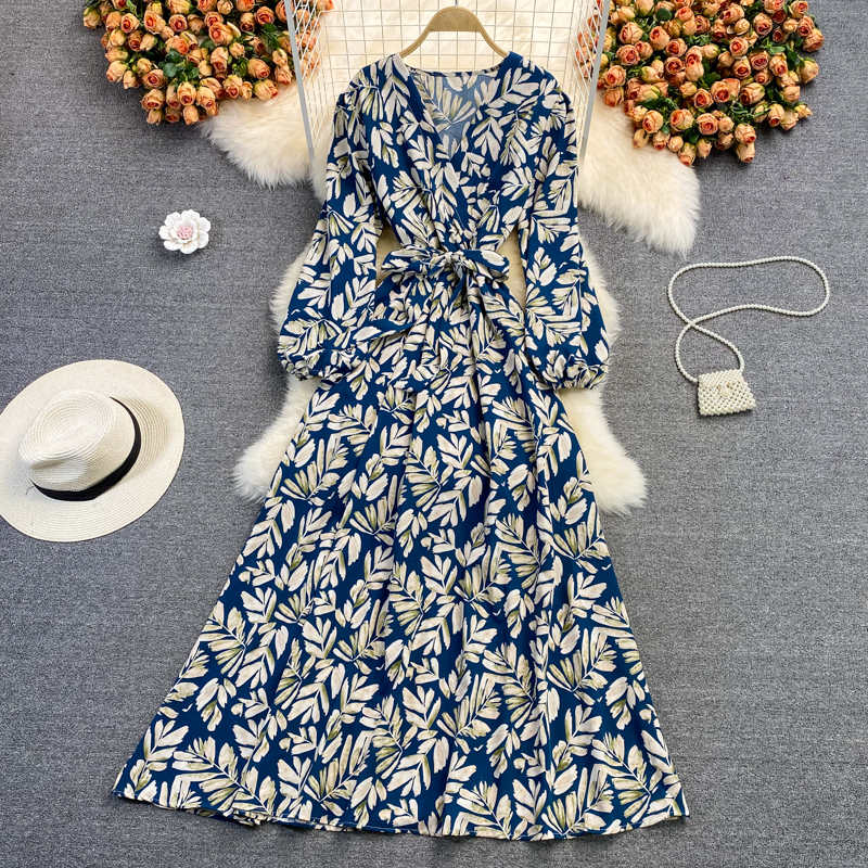 Cheap Dresses, Buy Quality Women’s Clothing Directly from China Suppliers:Puff Sleeve V neck Dress Autumn New Waist Slimming Elegant Floral Skirt over the Knee Large Swing Dress