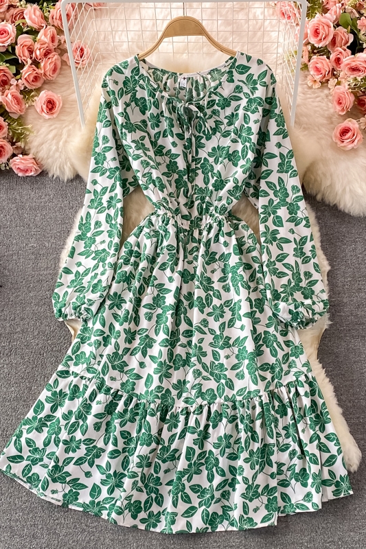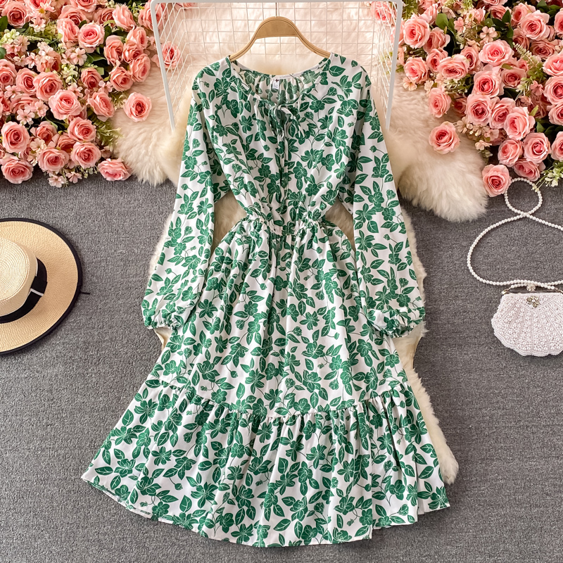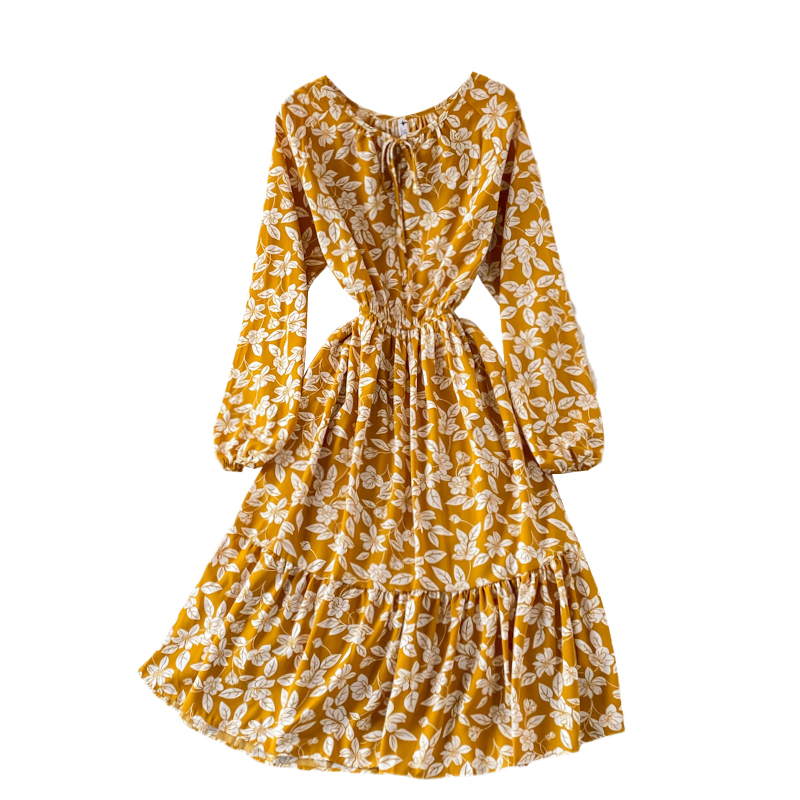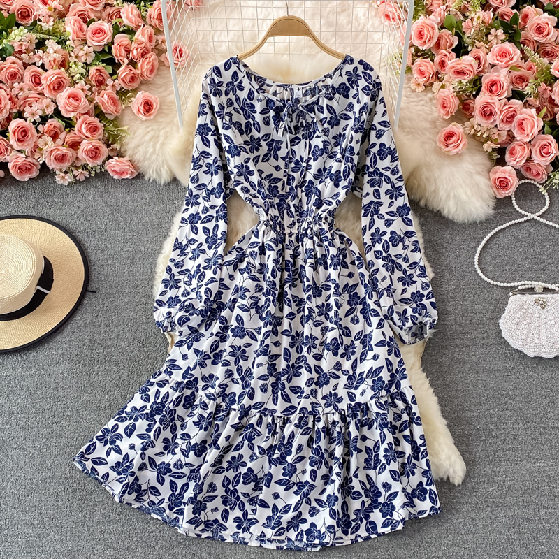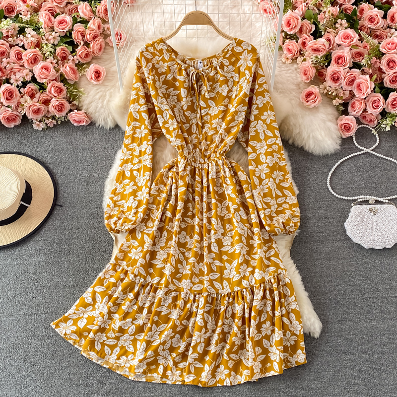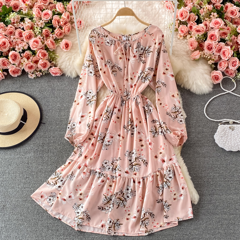 Cheap Dresses, Buy Quality Women’s Clothing Directly from China Suppliers:French round Neck Chiffon Dressautumn New Gentle Mid Length Waist Trimming Ruffles Floral Skirt