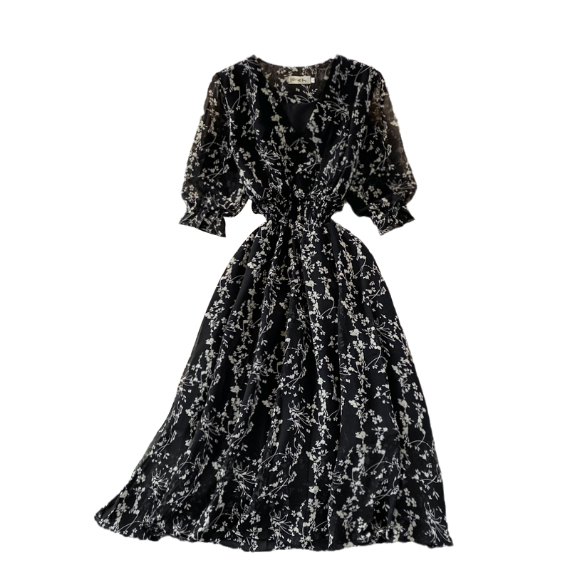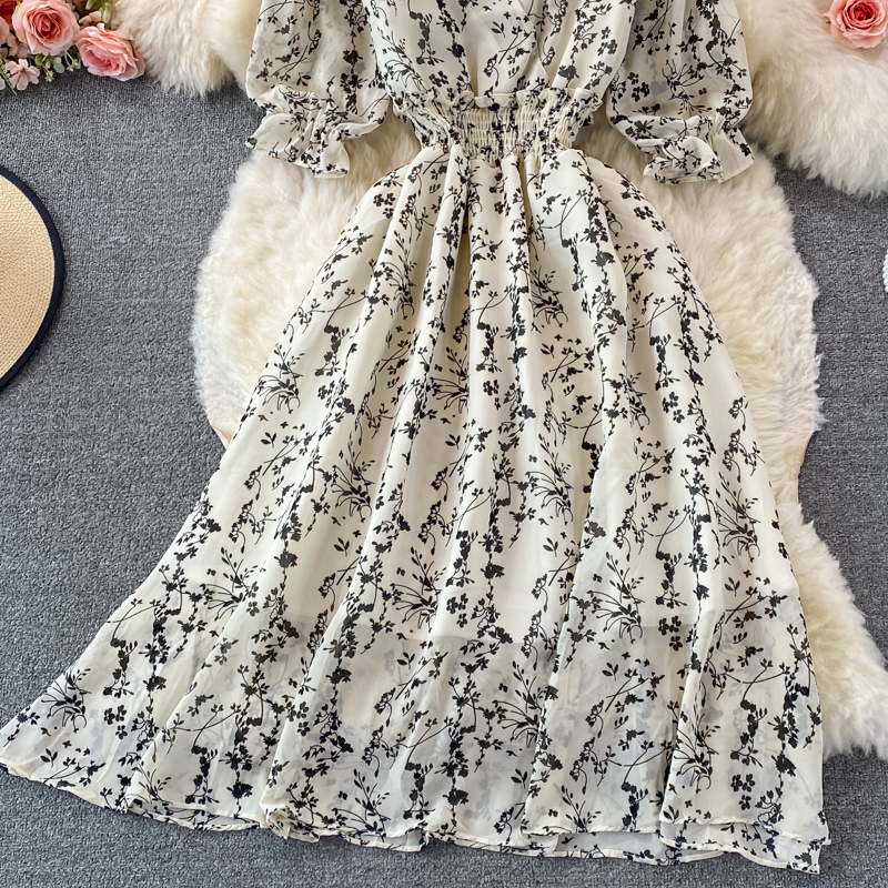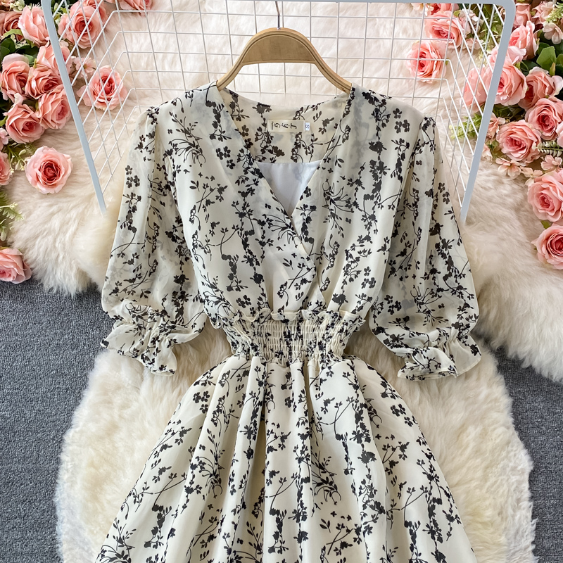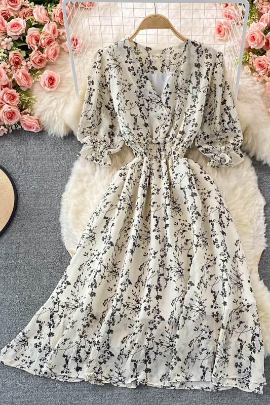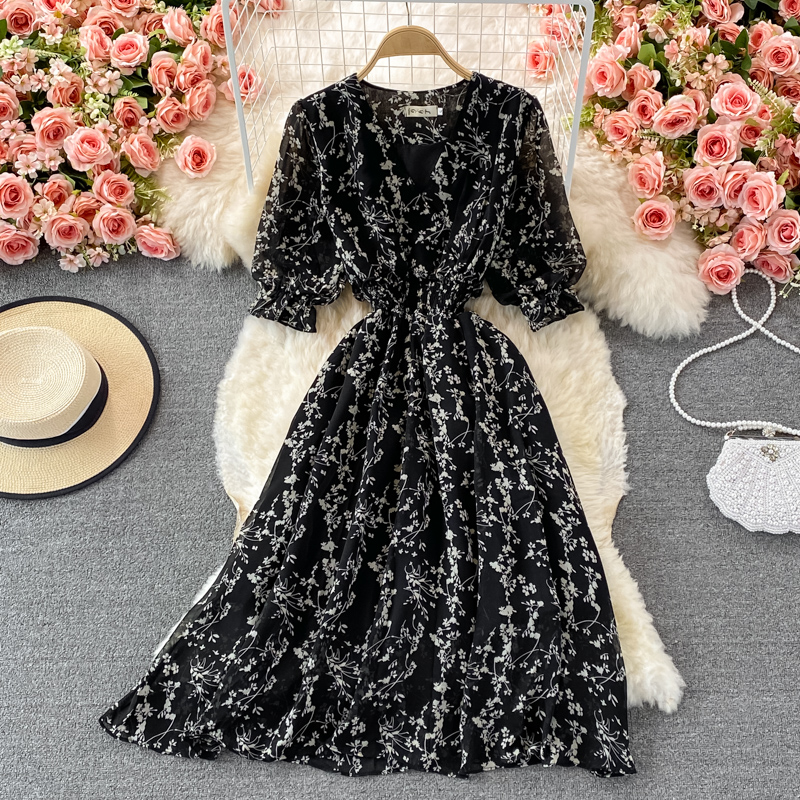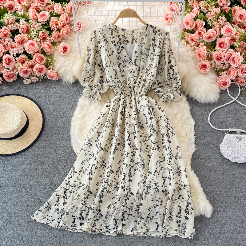 Cheap Dresses, Buy Quality Women’s Clothing Directly from China Suppliers:Summer New Korean Chic Retro V neck Waist Controlled Slimming Mid Length Puff Sleeve Floral Large Swing Dress