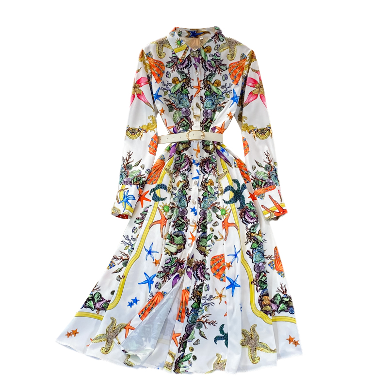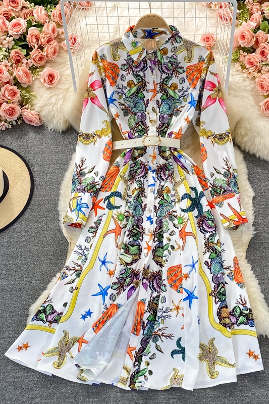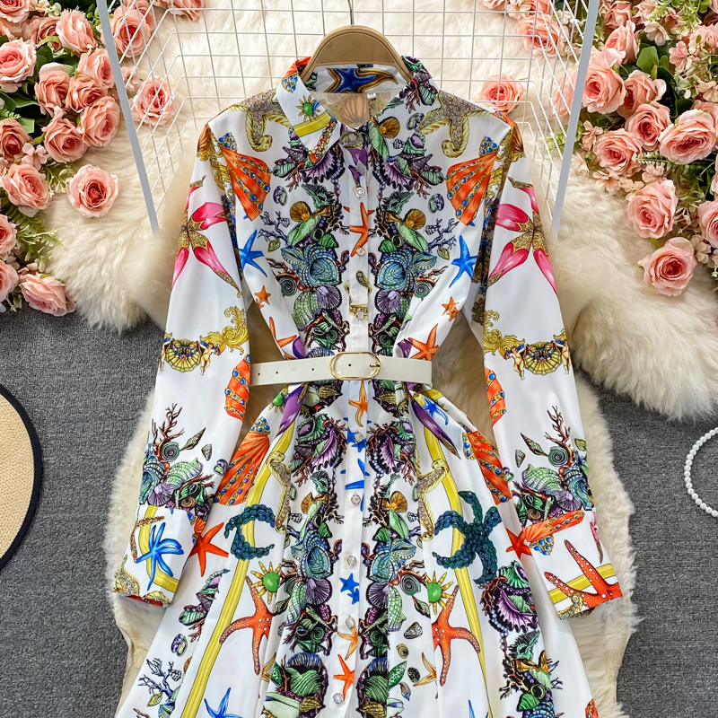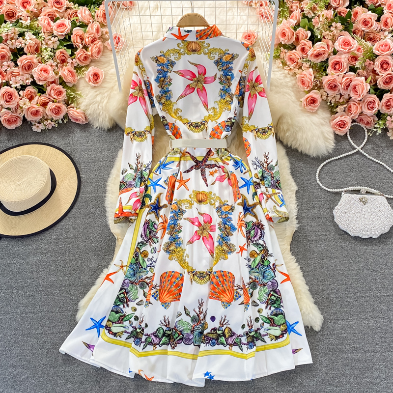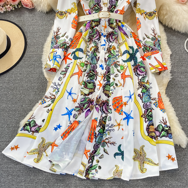 Retro high-end light luxury temperament printing waist slimming single-breasted lapel elegant high waist large swing dress