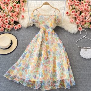 French Style Retro Gentle Style Strap Dress Summer New Super Fairy Sweet Puff Sleeve Floral Strapless Long Dress for Women