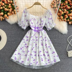 French Square Collar Chiffon Floral Dress Super Fairy Sweet Summer New Gentle Temperament Waist-Controlled Mid-Length Skirt