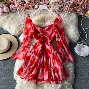 Spring and autumn style Mori drawstring pleated chiffon floral dress fashion temperament V-neck low-cut sexy A-line short skirt