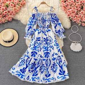 spring and autumn new lace-up collar off-shoulder celadon printed dress, long-sleeved waist, thin and large-length dress