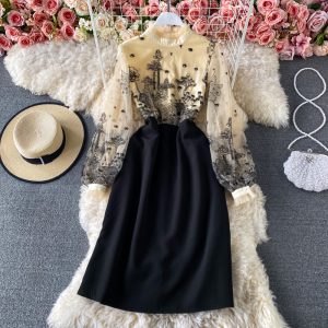 spring elegant temperament wood ear stand collar stitching embroidered mesh fake two-piece waist slimming a-line dress