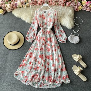 spring and autumn European and American printed lapel dress, long-sleeved waist and thin, fairy style holiday long skirt dress