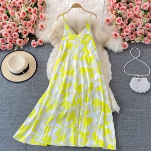 V-neck Printing Slip Dress Women ‘S Summer Loose Belly-Covering Seaside Holiday Beach Skirt Over The Knee Swing Long Dress