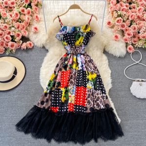 Vacation Style Sweet Lotus Leaf Printed Suspender Dress Summer New Fashion Waist-Controlled Lace Trim Large Swing Dress