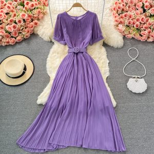 Waist Slimming Elegant Slightly Mature Style Pleated Dress Short Sleeve Summer New Elegant Graceful Long Expansion Skirt