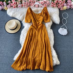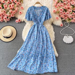 V-neck High Waist Backless Floral Chiffon Dress Short Sleeve Summer New Waist Slimming Graceful Long Expansion Skirt