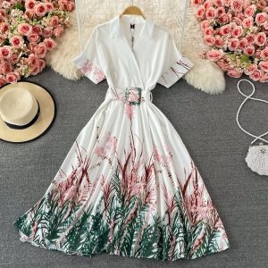 European Station Summer New French Retro Short Sleeve Printed Long Dress Waist Slimming Floral Large Swing Dress