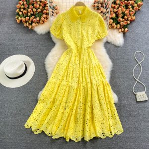 European Station Hollow Water-Soluble Lace Lapel Dress Short Sleeve Summer Waist-Controlled Large Hem A- line Dress Long Skirt