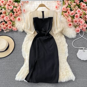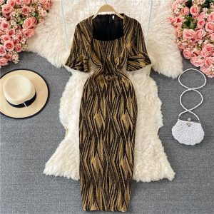 Fashion Ladies’ Evening Dress Summer New Temperament Square Collar Bright Silk Slim Fit Slimming Slit Sheath Dress
