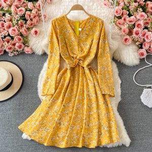 Fallnew French Style Vintage and Little Fresh Floral Skirt Waist Slimming Elegant V-neck Chiffon Dress