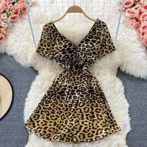 Fashionable Hot Girl Leopard Print Waist Slimming Elegant V-neck Dress Short Sleeve Summer French Style Small A- line Skirt